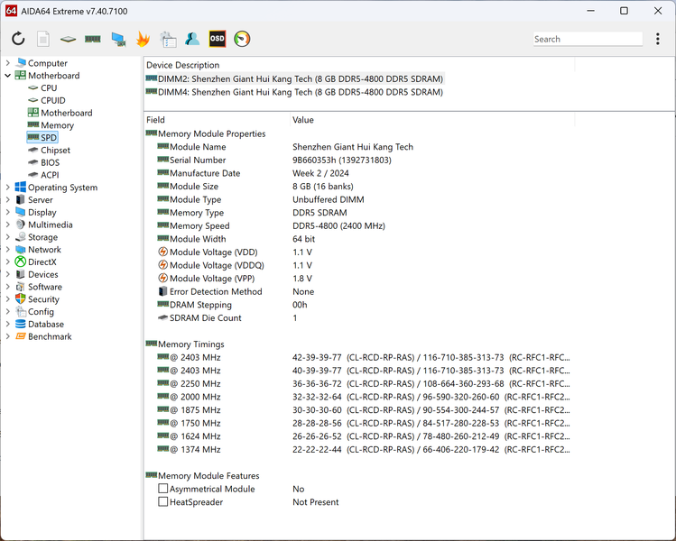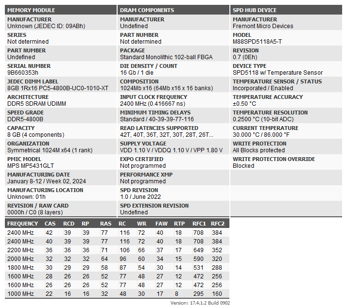 Тот случай, когда внешний осмотр дает больше информации, чем диагностические утилиты — визуально производителя памяти опознать можно, а Thaiphoon Burner спасовал. Впрочем, утилита давно не обновлялась, что нормально в моменты стабильности рынка, но не в процессе перехода со стандарта на стандарт. Информацию об организации модуля она тоже не может раскрутить корректно: «1024 Mb х 16» должно дать 16 ГБ, а не 8 ГБ. Так что из полезного здесь — полное отсутствие каких-либо «расширенных» профилей (типа XMP или AMD EXPO). Просто стандартная DDR5, сертифицированная для работы на частоте 4800 МГц или ниже.