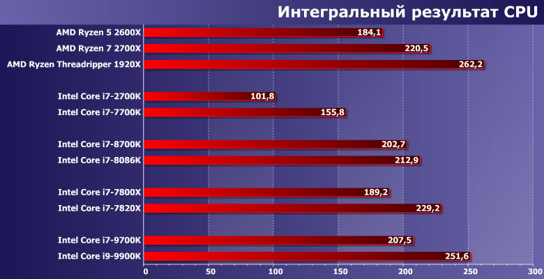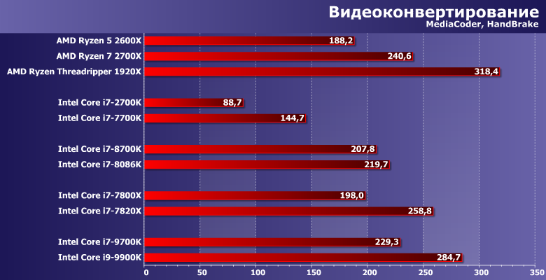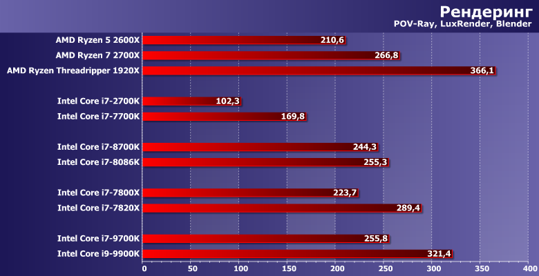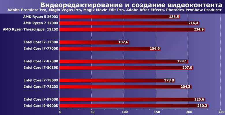 Единственная группа, где по-прежнему хорошо выглядят Skylake-X — а их преемники, наверняка, будут работать еще быстрее. Что же касается массовых платформ, то тут количество ядер все-таки в основном превалирует над качеством, а «виртуальная многопоточность» многим программам просто не нужна. В итоге с технической точки зрения имеем небольшое преимущество процессоров Intel, но с учетом цен превращающееся в очередную победу AMD. Впрочем, Core i7-9700K и в этом случае выглядит как раз неплохо — в отличие от старшего брата.