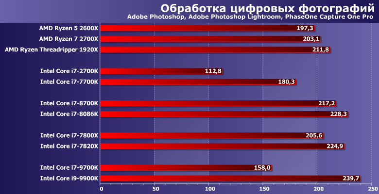 Но до сих пор нередки ситуации, когда масштабируемость ПО оставляет желать лучшего — они «неудобны» для всех многоядерных процессоров, зато дают некоторую фору решениям Intel. Хотя и здесь бывает всякое — один из фильтров Photoshop, как мы помним, в пакетном режиме сильно портит результаты всех процессоров без SMT, независимо от количества физических ядер, что сильно сказывается и на общем балле в группе. При этом ситуацию нельзя назвать совсем уж синтетической — используется он нередко. Правда в пакетном режиме — редко, так что на практике проблему можно и не заметить. Но неизвестно — где еще подобные могут вылезти (ведь если неприятность может случиться, то она случается). А теперь вспоминаем, что в новом поколении Core поддержка Hyper-Threading есть только в бюджетных Pentium Gold и в самых дорогих Core i9 — настольные семейства i3, i5 и (вот уже и) i7 ее лишены. Со всеми потенциально-возможными граблями. У AMD же и таковые могут встретить лишь покупателя Ryzen 3.