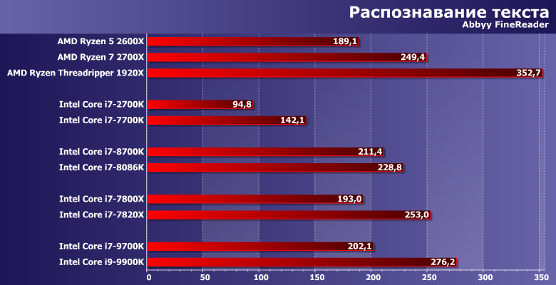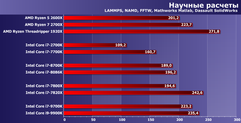 Простой целочисленный код, где качество ядер не имеет значение — главное количество. И SMT в таких условиях выдает максимум возможного. В итоге перед нами единственный случай, когда i7-9700К не удалось обогнать i7-8700K — получилось как в анекдоте: «восемь ядер — это, конечно, восемь ядер, но 12 потоков — это 12 потоков». А остальные результаты в подробных комментариях не нуждаются — все понятно.
