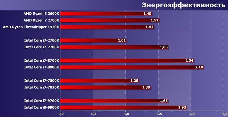 Соответственно, снизились и показатели энергоэффективности, хотя и остались в целом на хорошем уровне — к примеру, даже 9700K не уступает по этому параметру 7700K и немного превосходит старшие Ryzen. Поэтому сильно критиковать Intel не получается, но и похвалить в данном случае не за что.