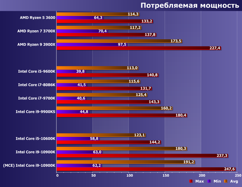 В принципе, энергопотребление 14 нм Core с микроархитектурой Skylake (последующие до сегодняшнего дня — лишь ее доработки и шлифовка) давно известно — порядка 15-20 Вт на ядро. Когда ядер было мало, проблем это не составляло в принципе: энергопотребление четырехъядерных моделей стабильно держалось даже ниже TDP. Когда стало много, появился своеобразный кумулятивный эффект, когда одно другому мешает (не забываем, что энергопотребление полупроводников приборов зависит от температуры — во многом и из-за этого последнюю стараются держать в рамках, а не только, чтоб не сгорело).