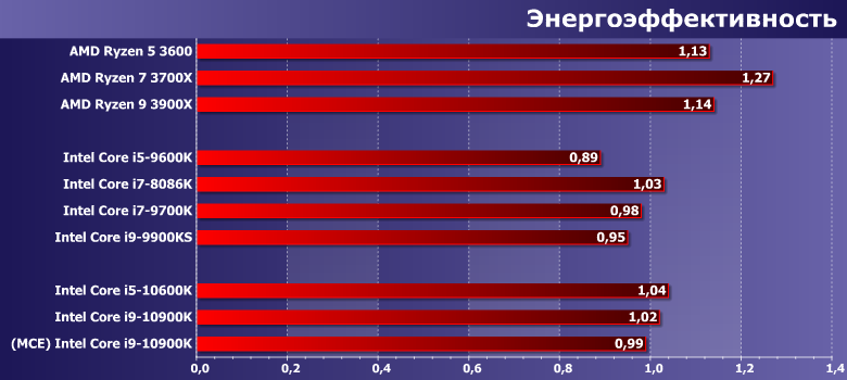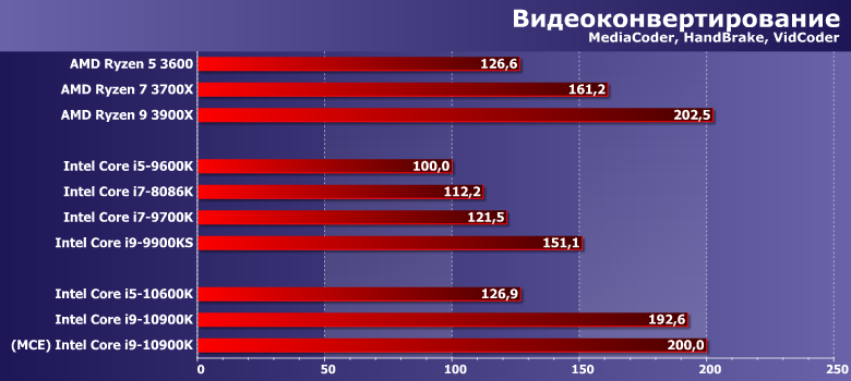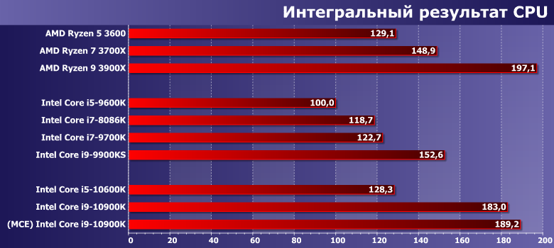 Потенциально переход с 8 ядер на 10 может давать до 25% прироста производительности — когда все линейно. На практике такое (или близкое) вполне возможно — что мы и наблюдаем. «Дотянуться» до Ryzen 9 все равно не выходит, поскольку разрыв в количестве ядер лишь сократился, но не исчез, но этого может и хватить. Понятно, что до сих пор при прочих равных или небольшом преимуществе AMD большинство покупателей выберет процессор Intel — вот как раз небольшое преимущество и осталось. А в более низких сегментах все вообще хорошо, поскольку количество ядер теперь в линейках процессоров двух производителей одинаковое. Впрочем, преимущество процессоров AMD в цене сохраняется, но уже не столь радикальное. Одно дело, когда Ryzen 5 3600 (с рекомендованной ценой $199) спокойно обгонял процессоры Intel по $374-$385 (так позиционируется Core i7-9700K) — и совсем другое, когда он лишь равен модели за $262-$263. Тем более, подобных 3600, но подешевле пока в ассортименте AMD нет — а у Intel есть вплоть до Core i5-10400F за $155. Включение МСЕ и небольшое увеличение частоты памяти эффект дает — получаем дополнительно еще около 5% производительности. Чем за это приходится расплачиваться — увидим позже. Пока же просто учтем, что и это не позволяет догнать Ryzen 9 3900X, хотя и сокращает разрыв до минимального.