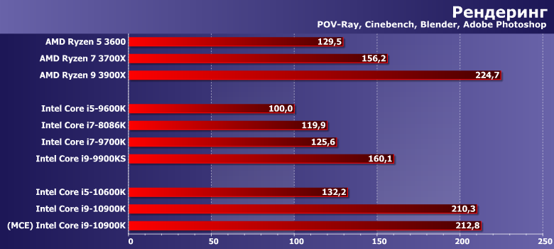 Практически те же 25% — даже чуть больше благодаря подросшим частотам (и ядер и памяти). И опять небольшое отставание от Ryzen 9 3900X — уже небольшое, а не почти полтора раза как раньше. И Ryzen 5 уже действительно конкурент Core i5, а никак не победитель Core i7. То есть принципиально расклад на рынке не меняется — просто конкуренция перестает быть однозначной, а становится действительно конкуренцией. Что еще интересно — в данном случае включение МСЕ к видимому эффекту не приводит: производительность меняется на пренебрежимый 1%. Но и ничего удивительного — разумеет, программы рендеринга и без дополнительной помощи загружают процессор работой на 100% — вот ничего улучшить и не получается. Даже при отключении лимитов энергопотребления — тут уже только вручную разгонять остается.