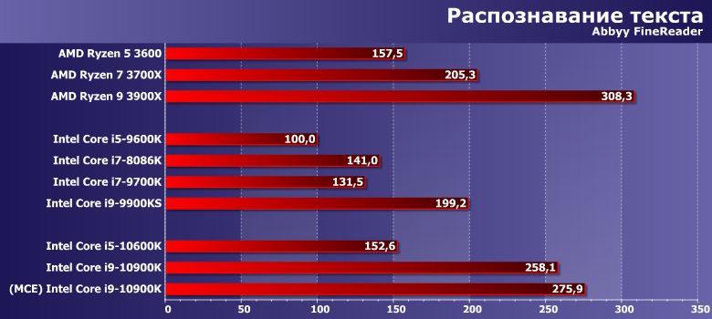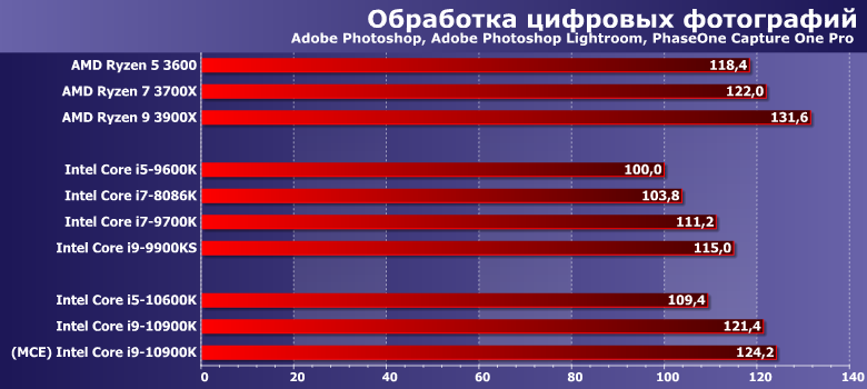 А вот после хорошего и «плохой» случай. Впрочем, до выхода Ryzen 3000 он был как раз «хорошим» для Core — за что и наступила расплата. И в любом случае — хоть не такой позор, как раньше: когда Ryzen 5 3600 по очкам обгонял все процессоры для LGA1151. Теперь для этого хотя бы уже нужен Ryzen 7 3700X, а то и 3800Х — 10900К на топовой плате (где работает Multi-Core Enhance) первого немного побыстрее. С другой стороны, и у Ryzen производительность немного от системных плат зависит, да и подобный небольшой прирост «выжать» можно настройками. Например, недавно мы уже видели порядка 3% разницы в производительности Ryzen 7 3800X в этой группе программ, когда сравнивали платы на Х570 и Х470 (причем с преимуществом как раз более старой и дешевой платформы). Поэтому выискивать отличия с микроскопом не стоит. Общий же вердикт — для работы с данными программами отлично подходят и Ryzen, и Core (современные модели в обоих случаях, конечно), но первые — как и ранее, чуть предпочтительнее, хотя вторые с выходом новой платформы сократили отставание.