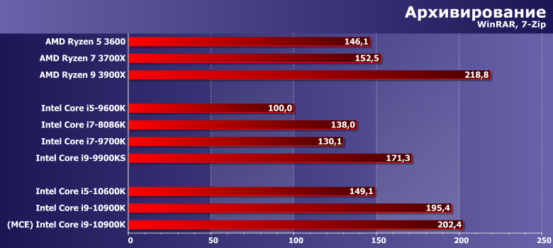 В архиваторах узким местом для Ryzen давно уже является архитектура кэш-памяти третьего уровня — ее разделенность по блокам. Да и то, что емкость вообще меняется скачками — в принципе тоже. Поэтому Ryzen 7 и не мог заметно опередить Ryzen 5 — что резко менялось при переходе к Ryzen 9 (благодаря удвоению размеров L3). Но конкурировать с процессорами Intel раньше это не слишком мешало, поскольку и Ryzen 5 3600 достаточно было для того, чтобы обогнать любые Core i7, а не только лишь Core i5. Соответственно, свою задачу выполнял и Ryzen 7. Теперь положение дел стало более сложным, поскольку Core i5-10600K вышел на примерно тот же уровень, а Core i7-10700K как минимум не отстанет от Core i9-9900KS. Впрочем, Ryzen 9 как доминировали, так и продолжат, конечно — причем даже 3900Х, который стоит на уровне старших моделей для LGA1200. Точнее, до последнего времени стоил — сейчас-то он должен еще подешеветь; и этот процесс уже начался.