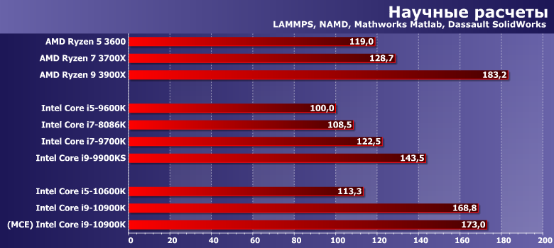 В этой группе программ масштабирование по ядрам хуже — во-первых. Во-вторых, разработчики наконец-то переварили архитектурные особенности процессоров Intel, не меняющиеся с 2015 года — но вот на «полную утилизацию» Ryzen (особенно последних) им пока еще времени не хватило. Поэтому новые модели «десятого» поколения в межфирменной конкуренции выглядят вообще идеально. А во внутрифирменной — все стандартно: новые Core i9 существенно быстрее старых, а новые Core i5 не хуже старых Core i7. Мы уверены, что и с новыми Core i3 и i7 будет тоже самое — то есть первые смогут заменить старые Core i5, а вторые не будут уступать старым Core i9. Собственно, не с чего рассчитывать на обратное — именно так все специально и делалось. Дополнительные 3% от МСЕ — тоже неплохо. Хотя и, в очередной раз, не принципиальны — в предыдущих группах это не позволяло догнать Ryzen 9 3900X, а здесь это и без МСЕ получалось.