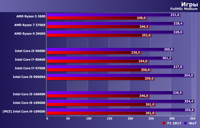 В принципе — ничего особенного. Да и неудивительно — на данный момент не утихают споры: достаточно ли для игр процессоров с конфигурацией 4C/8T или в качестве разумного минимума следует воспринимать 6С/6Т... Но даже второе сегодня у нас представлено лишь в исполнении «старых» (уже) Core i5 для LGA1151, а остальные участники «посерьезнее». Лучшим же игровым процессором должен автоматически стать Core i9-10900KF (благо чуть дешевле, чем 10900К, но IGP при таком использовании не нужен), однако выискивать какие-то детали уровнем выше Ryzen 5 3600 и (теперь уже и) Core i5-10x00 нужно с микроскопом и предметно. Либо не выискивать, а купить, например, Core i7-10700 — который, скорее всего, ни в чем не будет уступать Core i9 и обгонять все Ryzen. В любом случае, для начала нужно будет купить видеокарту хотя бы долларов за $500 и не использовать высокие разрешения (что уже в какой-то степени оксюморон) — иначе поиск утратит всякий смысл.