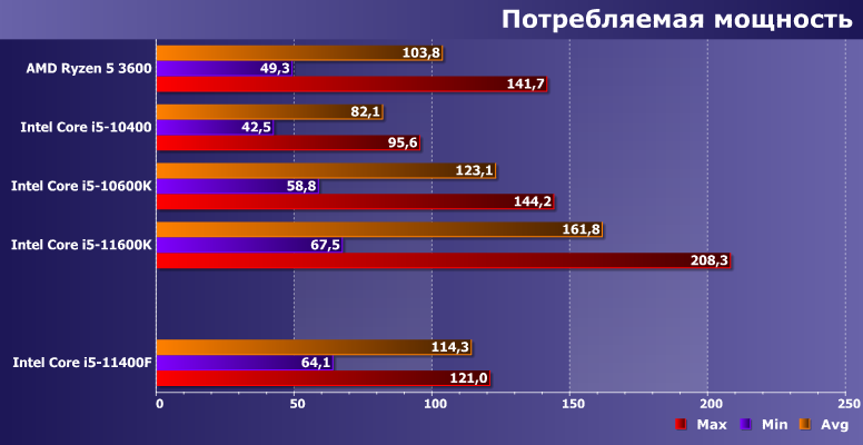 Выше мы регулярно наблюдали, как при «тяжелых» продолжительных нагрузках Core i5-11400F упирался именно в ограничения энергопотребления. Пусть современные процессоры относятся к лимитам и творчески, так что на практике речь идет, скорее о 80 Вт (которые мы и наблюдали в этих тестах), а не 65 Вт, но это тоже немного. Были бы выше предельные значения — пропорционально выросли бы и реальные. Так, например, Core i5-11600K «умеет» потреблять и 160 Вт, а топовый Core i9-11900K и в наших тестах доходил до 190 Вт — при формальном TDP 125 Вт, т. е. вдвое выше, чем у процессоров «обычных» серий.
