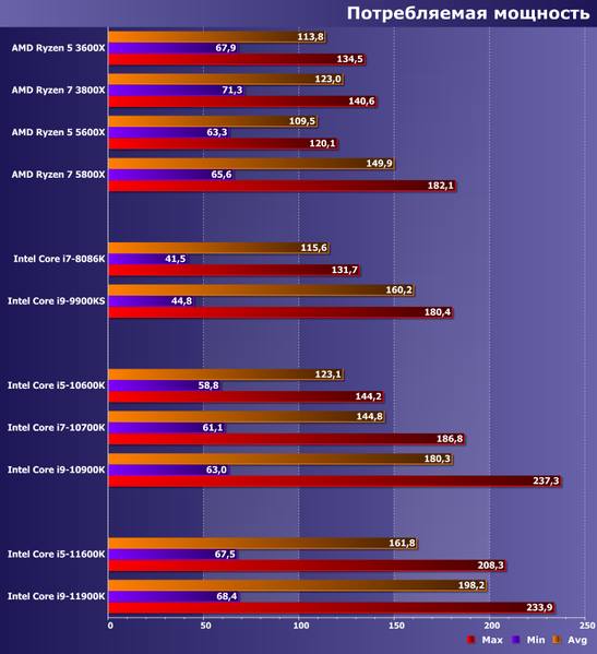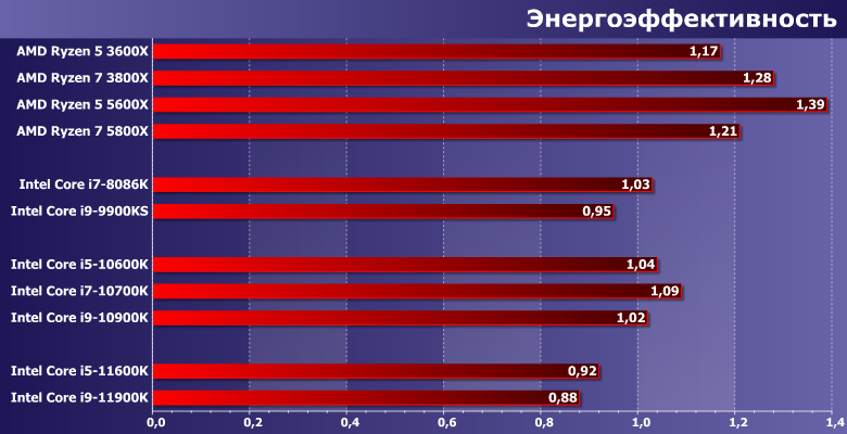Как и следовало ожидать, новинкам и тут блеснуть нечем. Понятно — почему в Intel оттягивали усовершенствование микроархитектур до внедрения новых технологий производства: ядра стали сложнее, на том же техпроцессе — больше, «жрут» тоже больше. При выпуске LGA1200 этим вопросом озаботились — поэтому у новых систем проблем с такими «аппетитами» нет, а вот у Core i9 для LGA1151 они встречались, несмотря на более низкое энергопотребление. Но увеличивать его без меры все равно нельзя, да и какой-то «запас» энтузиастам оставить нужно — поэтому пришли к той же границе, что и год назад. И, возможно, именно поэтому изначально не было даже планов о выпуске десятиядерных Rocket Lake — они бы «раскочегарились» до совсем неприличных значений, да и восьмиядерным, похоже, не совсем хватает. А так — уровень «старых» Ryzen 9 серии 3000, но новые Ryzen 5000 стали и быстрее, и экономичнее.