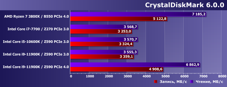 На сколько? Подробно мы этот вопрос изучим позднее, а пока небольшая часть результатов, полученная при помощи WD Black SN850 2 ТБ (на сегодня — один из самых быстрых SSD с поддержкой PCIe 4.0). Хорошо заметно, что в плане пиковой пропускной способности ничего у Intel не менялось с 2015 года. И, если продолжать подключать накопители к чипсету, не изменится и сейчас. А если использовать «процессорный» разъем — можно радикально ускориться. Пессимисты, впрочем, отметят, что какое-то отставание от AMD все равно сохранилось — оптимисты возразят, что почти два года оно было принципиальным.