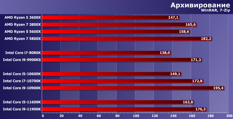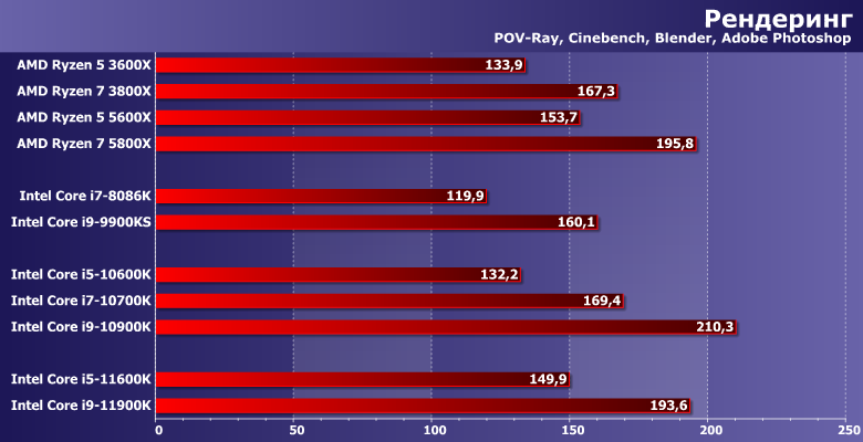 Если бы прошлогодних обновлений не было, все выглядело бы красивее — новые Core i5 сопоставимы со старыми Core i9 и существенно быстрее Ryzen 5. Но они были, причем у обеих компаний — так что на этом фоне новинки выглядят уже не так выигрышно. AMD, например, при смене Zen2 на Zen3 производительность удалось увеличить сильнее. Да и в парах «младший-старший» разница больше — но это может быть как раз следствием уже устаревших производственных норм Intel, из-за чего приходиться как-то балансировать между скоростью и энергопотреблением. Из-за чего Core i9-11900K выглядит вообще крайне неубедительно даже в рамках платформы LGA1200 — для таких нагрузок лучше купить i9-10900K или даже i9-10850K: они и дешевле, и быстрее! Ничего не поделаешь — большее количество ядер архитектурными улучшениями скомпенсировать сложно. Тем более, и их явно ограничили «производственники».