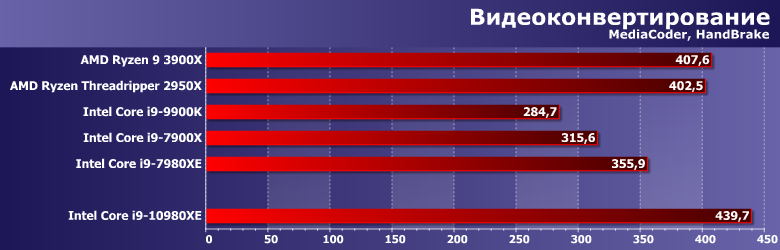 Была в Skylake-X какая-то чревоточинка — портящая жизнь в определенных алгоритмах. Ее нашли и обезвредили — иного объяснения у нас нет. Но обезвредили поздновато: на уровень Ryzen Threadripper вышли, причем (наконец-то!) при равных ценах, однако пора уже как-то бороться с Ryzen 3000 (Core i9-9900K, как видим, совсем не справляется), а не получается. И даже Threadripper на таких ядрах не требуется — хоть и не помешает.