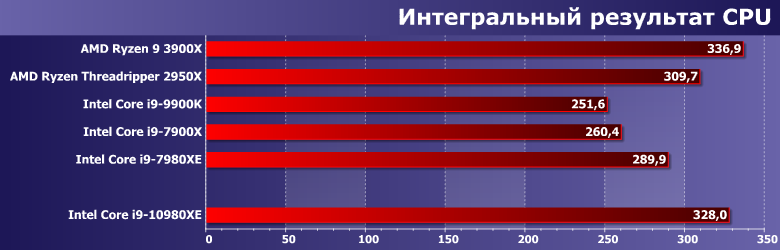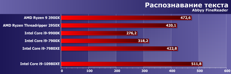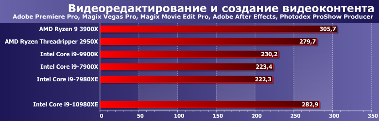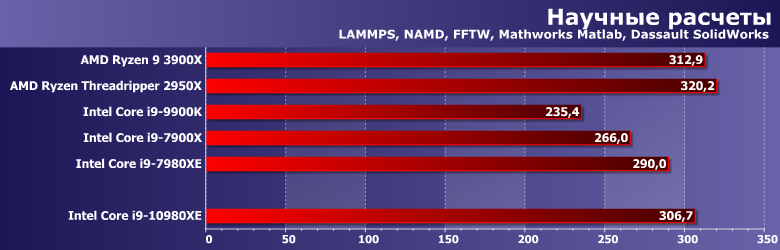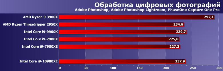 Цена наконец-то делает возможным непосредственное сравнение новинок с прошлогодними Ryzen Threadripper. Которые, напомним, «справлялись» ранее с Х-серией даже без учета ценовой форы (хотя на практике не учитывать двукратную разницу в цене невозможно). Теперь же этой разницы практически не осталось — а что с производительностью? Сравним ее со старшим в Х-линейке Threadripper 2950Х, который все-таки чуть дешевле, чем Core i9-10980XE, хотя и не принципиально.