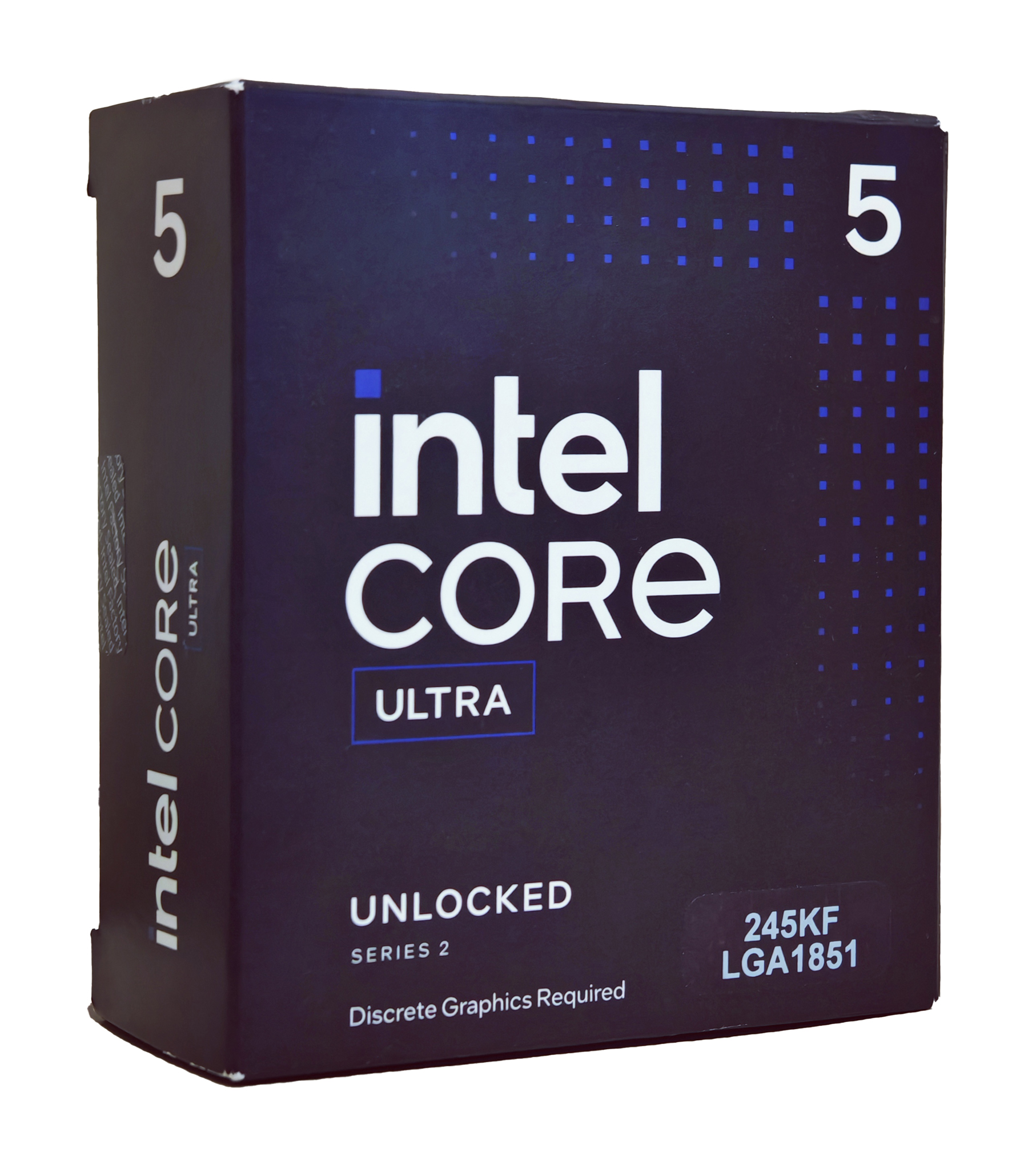 Процессор Core Ultra 5 245KF поставляется в более простой картонной коробке, по сравнению с флагманской моделью Core Ultra 9 285K, хотя основы дизайна и размеры коробки одинаковы для всех вышедших процессоров Core Ultra. В коробке также нет комплектной системы охлаждения. Сами новые процессоры внешне очень похожи на процессоры предыдущих серий, но, при одинаковых габаритах, расположение пазов для установки у них другое, а дополнительные контакты используют пространство посередине. Распределительная крышка у Core Ultra 200S чуть длиннее и уже, чем у семейства Raptor Lake, расположение SMD-резисторов и контактные площадки на лицевой стороне изменились. Но важнее всего то, что сохранена совместимость с кулерами, разработанными для LGA1700, это значительно облегчает задачу охлаждения новых процессоров.
