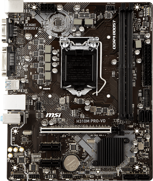 Примером дешевого (4800 рублей) варианта платы на чипсете Intel H310 может быть модель MSI H310M Pro-VD. Более дорогой вариант (6500 рублей) — плата Asus TUF H310-Plus Gaming.