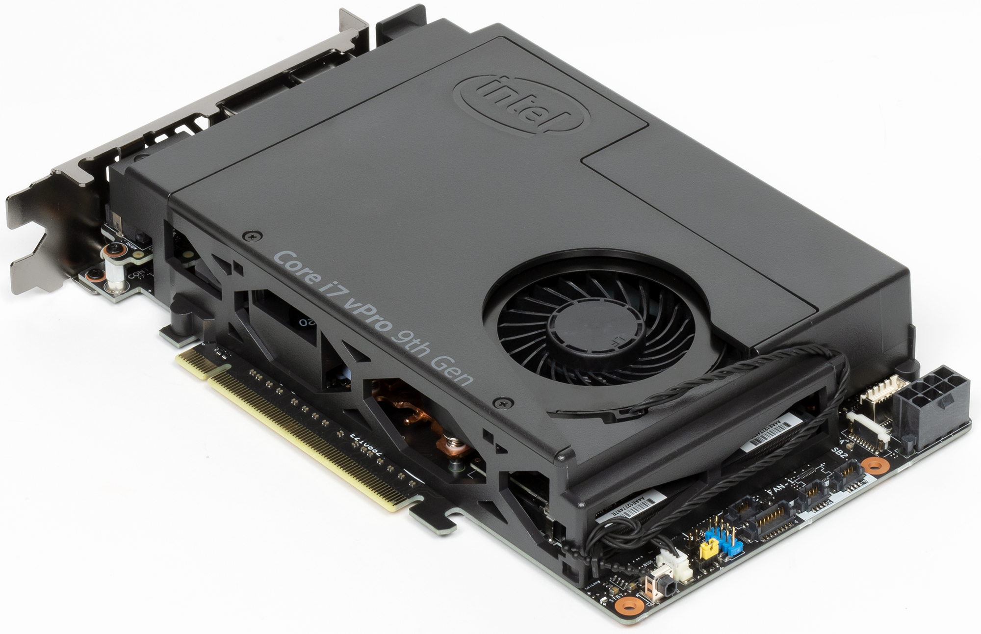 Полную разборку мы решили не показывать — она идентична Extreme, так что хорошо была отражена в предыдущем материале. С самой картой можно ознакомиться в деталях там же. Отметим, что внешне отличаются только надписи на кожухе, а если снять систему охлаждения, то все пять существующих на данный момент «элементов» выглядят идентично друг другу. Основных компонентов на плате два: процессор и чипсет CM246М. Пока во всех моделях используется именно этот чипсет, но при смене платформы, естественно, нужно будет что-то другое. А процессоров на данный момент пять, все — девятого поколения: Core i9-9980HK, Core i7-9750H и Core i5-9300H в серии Extreme и Core i7-9850H или Xeon E-2286М в серии Pro. В чем отличия? В реализации всевозможных технологий Intel для корпоративных систем — vPro, RSTe, Standard Manageability, Trusted Execution и пр., для чего подходят не все мобильные процессоры. Core i7-9850H или Xeon E-2286М всем требованиям как раз удовлетворяют. Кроме того, восьмиядерный Xeon E-2286М снабжен графикой UHD Graphics P630, а не «обычным» UHD Graphics 630, что без дискретки во многих профессиональных приложениях, вообще говоря, заметно. Что интересно, в рознице эта модель NUC 9 Pro нередко стоит дешевле, чем старший Extreme, хотя рекомендованная розничная цена Xeon E-2286М официально выше, чем у Core i9-9980HK. Соответственно, если не интересует разгон (а кого он интересует — тех обычно не интересуют мини-ПК) и не нужны черепа — есть неплохой способ сэкономить. С Core i7, к сожалению, фокус не проходит — так что выбирать Pro следует, только если нужно vPro. С другой стороны, если vPro не нужно (что нередко встречается в небольших компаниях), то можно сэкономить именно на этом. В основном компьютеры линейки взаимозаменяемы — за исключением таких вот нюансов.
