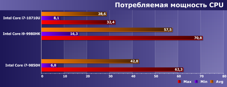 Иллюстрация сказанного выше: при одинаковых лимитах восьмиядерные процессоры «выбирают» их целиком, а вот у шестиядерных остается даже некоторый запас. Среднее же энергопотребление различается почти в полтора раза, при этом у Core i7-9850H оно в те же полтора раза выше, чем у еще более «зажатого» Core i7-10710U — хотя теоретически могло бы отличаться и в два раза.