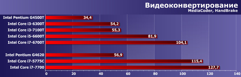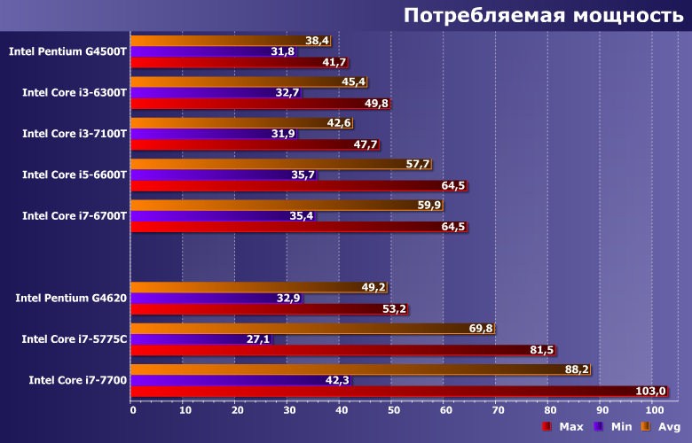 Чудес на свете не бывает, так что G4500T с треском проиграл всем. Core i3 работают чуть хуже современного Pentium — тоже плата за суффикс «Т», поскольку без него, все-таки, как мы уже выяснили, даже старенький i3-6100 все равно быстрее G4620. Да и Core i7-6700T самый медленный из всех трех Core i7. Впрочем, его результаты выше, чем у референсного AMD FX-8350, который и сам по себе требует на сотню Ватт больше, и еще без видеокарты не обходится.