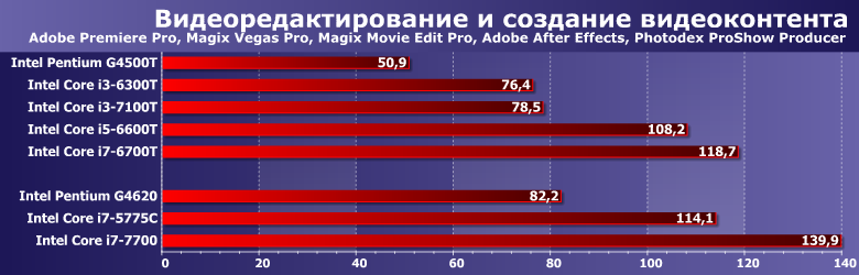 Как обычно «порезвился» Photoshop (точнее один из используемых нами до последнего времени фильтров), хотя это не так и важно — как видим, всем программам вообще важна однопоточная производительность и, желательно, стабильная. Поэтому и старательно сбрасывающий частоту при первой возможности i7-6700T тоже не блещет. Зато поразили оба Core i3, практически не уступающие или вообще превосходящие Pentium G4620, несмотря на заметно более высокую тактовую частоту последнего.