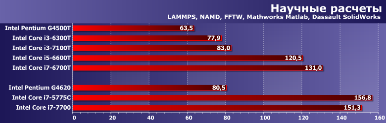 А вот при не совсем равных возможны варианты. В частности, в этой группе SkyLake/Kaby Lake заметно быстрее предшественников и при сопоставимых частотах, так что i7-6700T оказался в общем зачете вторым, а не третьим.