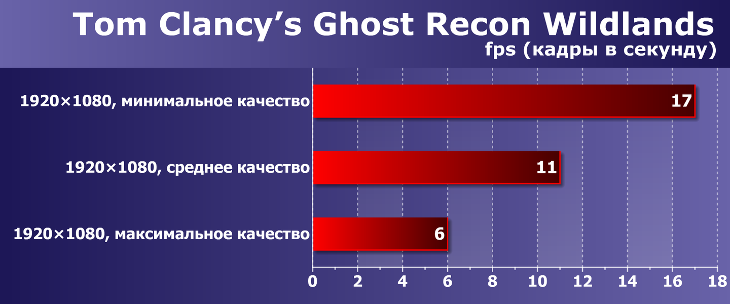 В тактическом шутере Tom Clancy’s Ghost Recon Wildlands снижение качества графики немного помогает, но все равно в Full HD нормально играть не удастся.