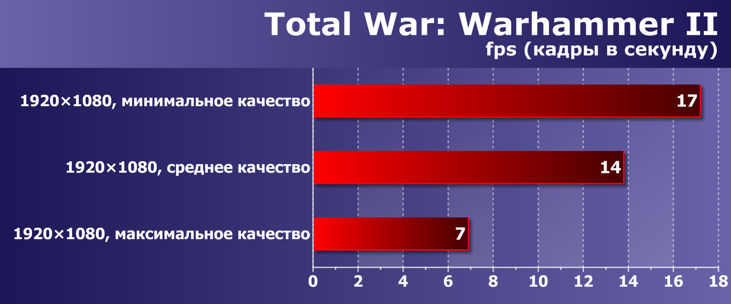 Стратегия Total War: Warhammer II предлагает отличную детализацию фигурок и сражений, здесь производительности системы в Full HD тоже недостаточно даже при минимальном качестве графики.