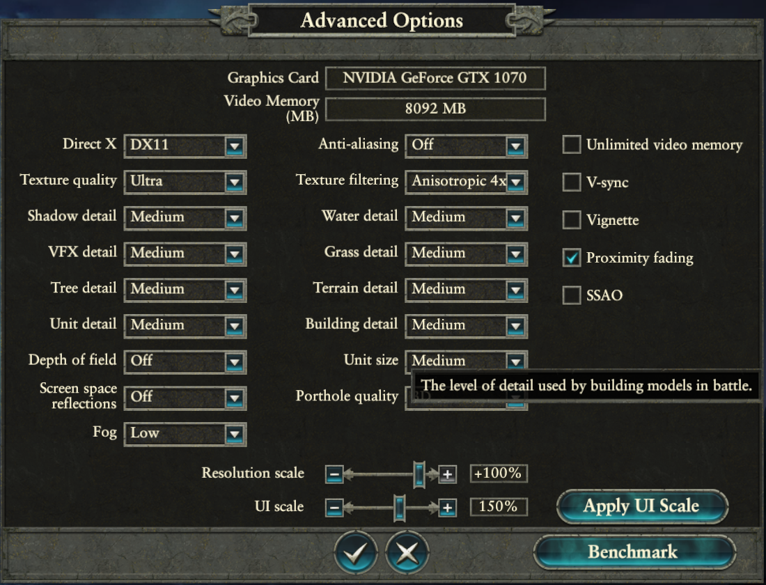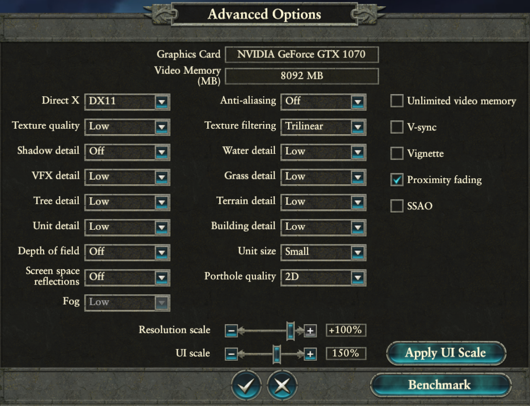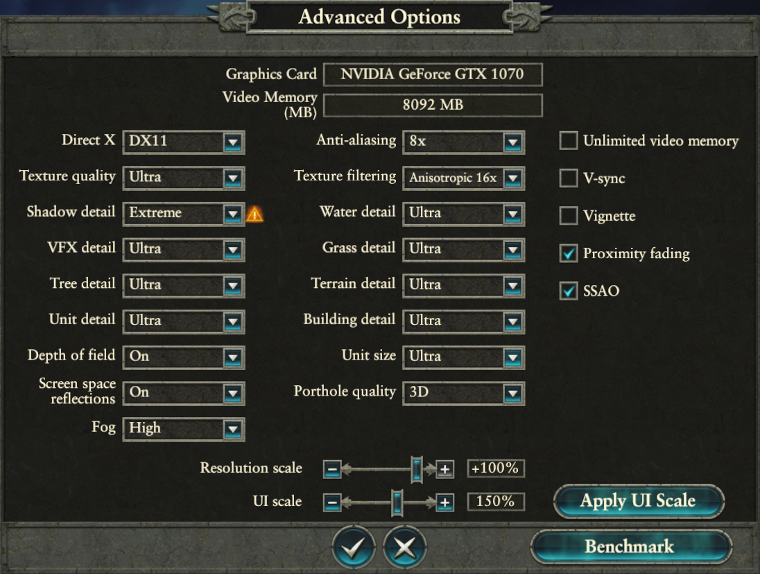 В игре Total War: Warhammer II есть небольшой встроенный бенчмарк, который мы и используем для тестирования. Причем бенчмарков даже два: battle benchmark и campaign benchmark. Мы для тестирования используем бенчмарк battle benchmark.