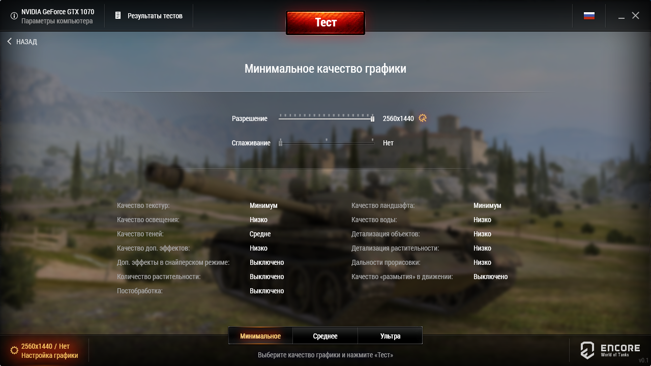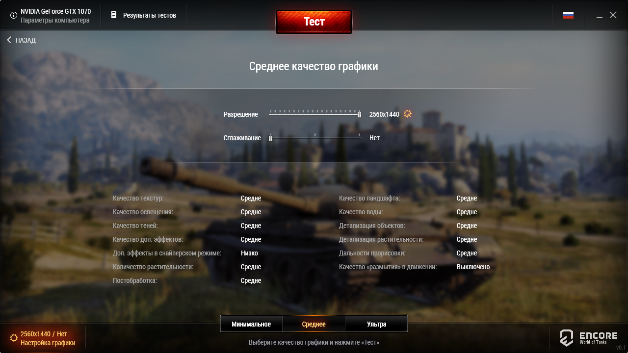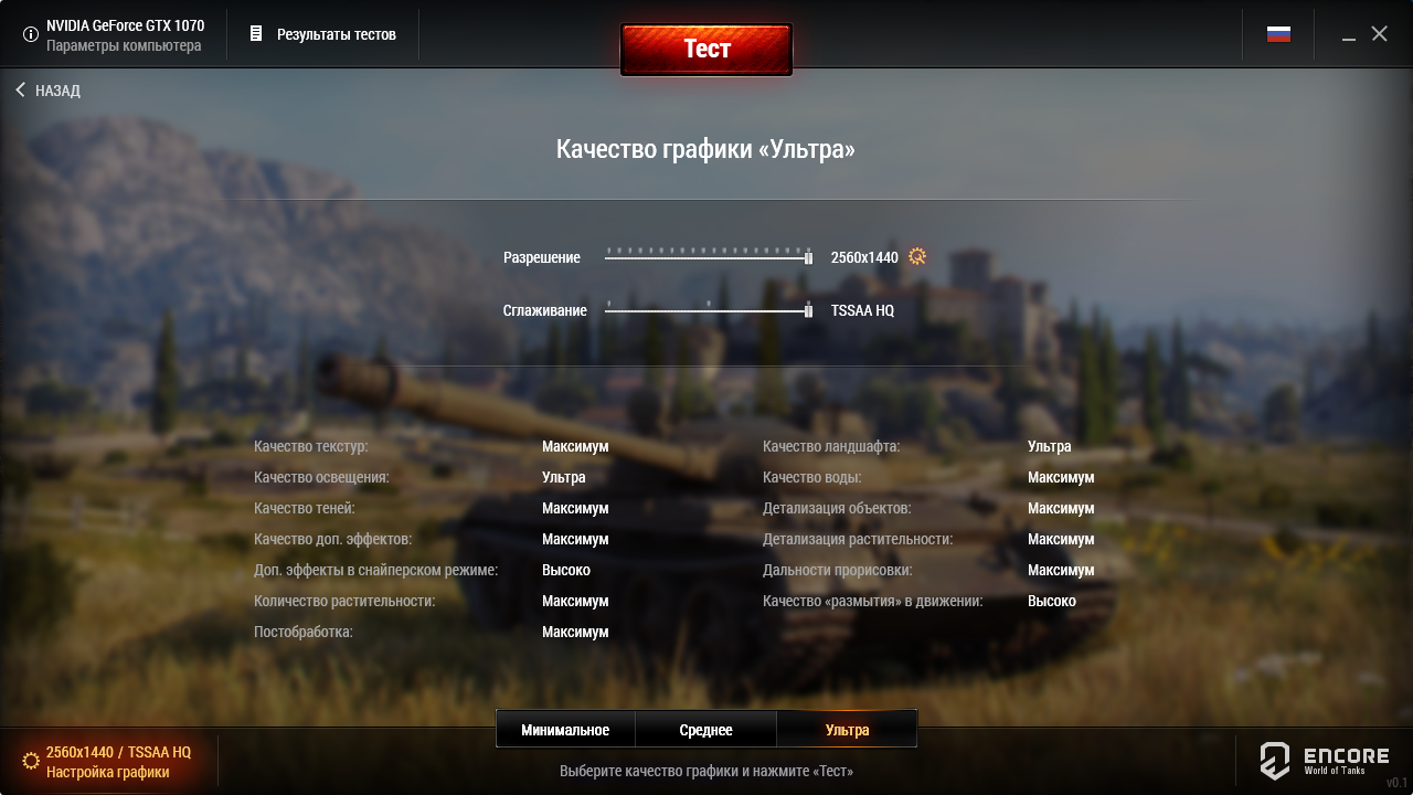 Для новой версии игры World of Tanks 1.0 компания Wargaming выпустила отдельный бенчмарк на базе нового графического движка World of Tanks. В этом игровом бенчмарке предусмотрено три режима настроек качества: Ультра, Среднее и Минимальное. Именно эти режимы мы используем при тестировании.