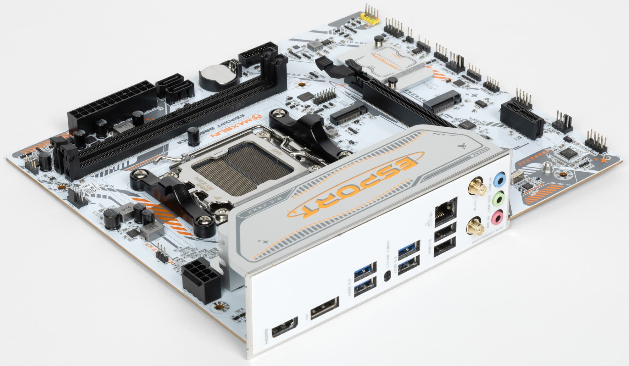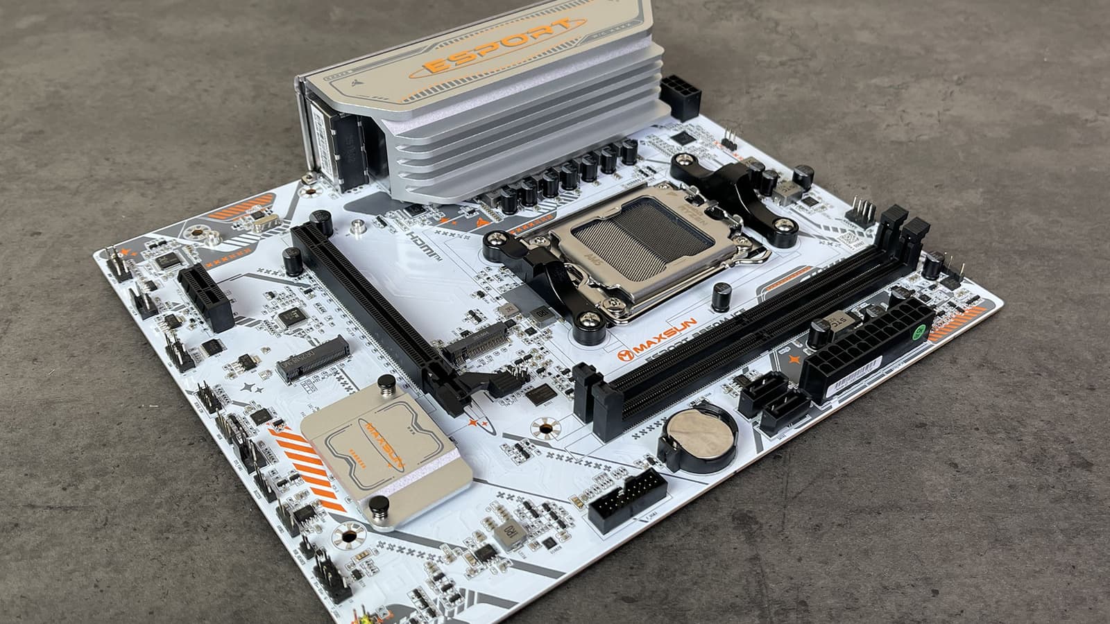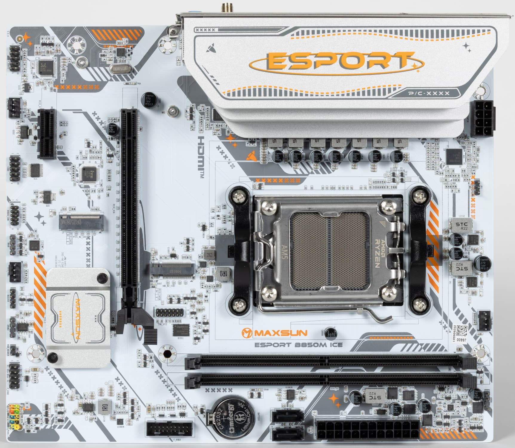 Maxsun eSport B850M WiFi Ice поставляется в коробке красивого дизайна серии eSport. Комплект размещен под платой в отдельном отсеке.