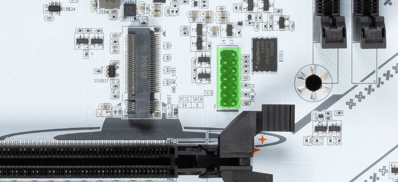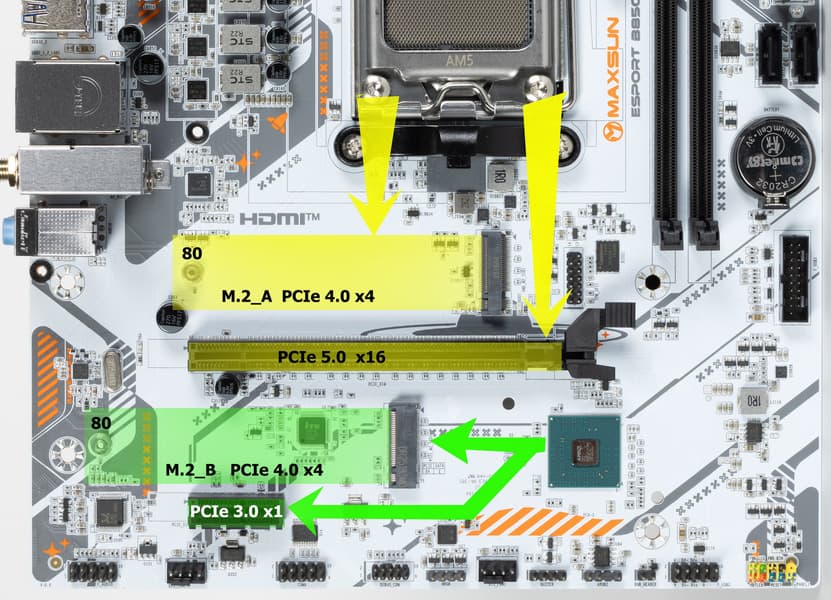 Второй слот M.2 (M.2_B) получает данные от чипсета B850, а первый M.2_A — от CPU, при этом оба M.2_A/B получают PCIe 4.0 (производитель понизил версию PCIe для «процессорного» слота M.2, а также вообще не реализовал оставшиеся у CPU 4 линии PCIe).