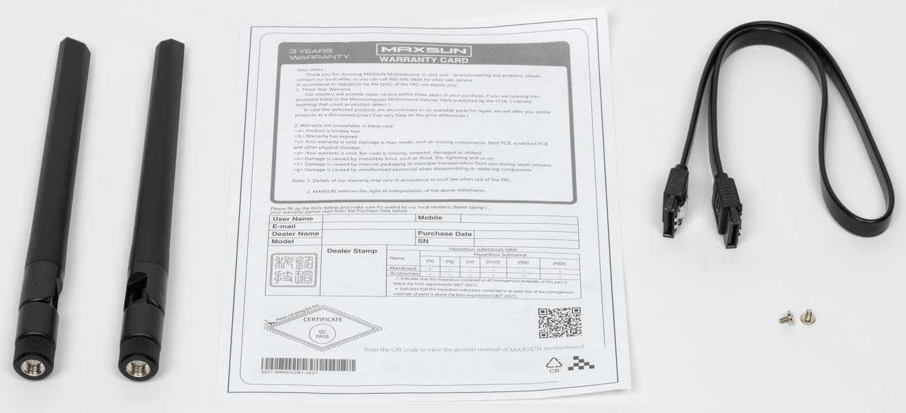 В комплект поставки входят: краткое руководство пользователя (детальное можно скачать с сайта производителя), один кабель SATA, запасные стойки для слотов M.2 и антенны встроенного Wi-Fi-модуля.