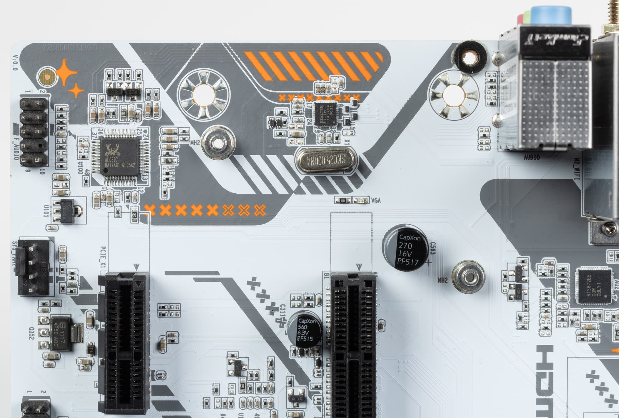 Аудиотракт вынесен на угловую часть платы, не пересекается с другими элементами. У платы на задней панели три стандартных разъема мини-джек по приему и выводу сигналов. S/PDIF отсутствует.