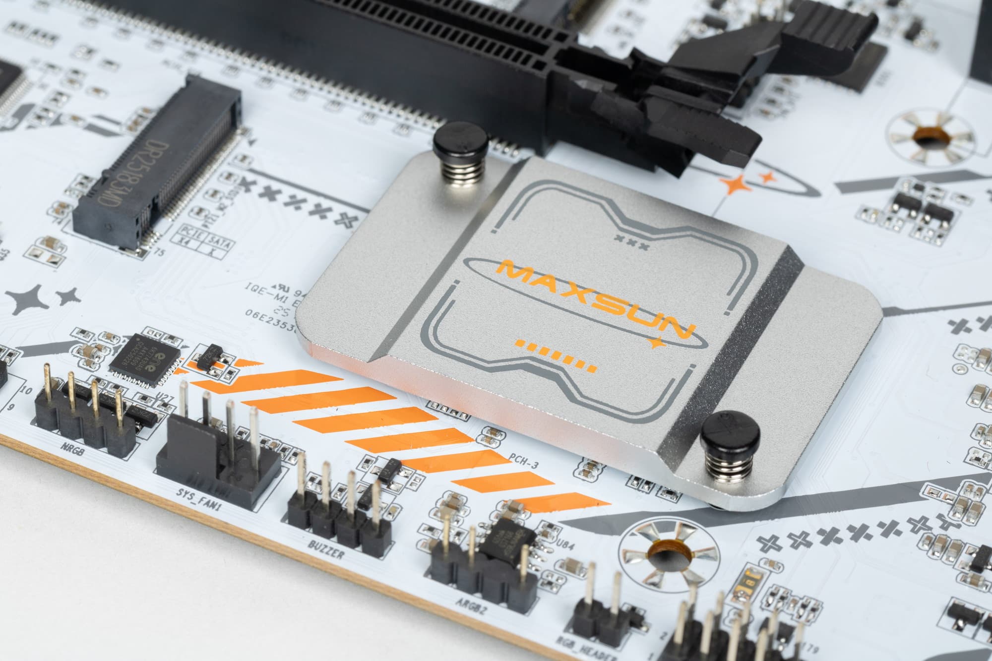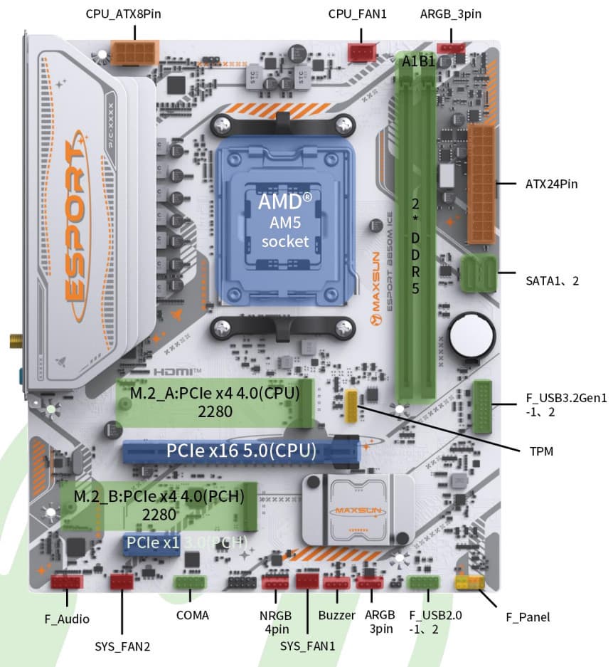 Форм-фактор Mini-ITX имеет размеры 170×170 мм, microATX до 244×244 мм, ATX до 305×244 мм, а E-ATX — до 305×330 мм. Материнская плата Maxsun выполнена в форм-факторе microATX, имеет размеры 244×210 мм, и на ней имеются 6 монтажных отверстий для установки в корпус с.