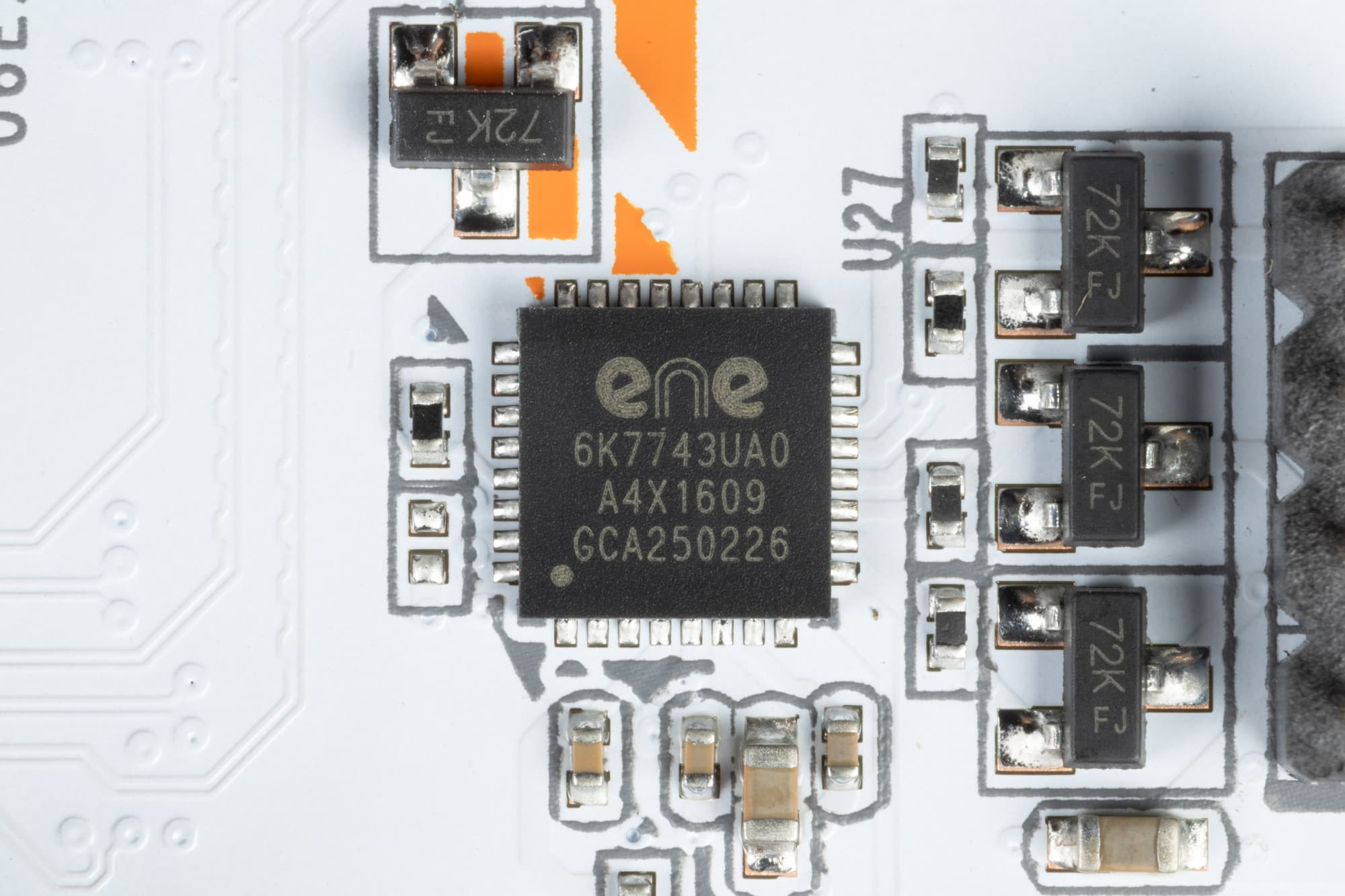 На оборотной стороне расположены некоторые электронные логические элементы. Текстолит обработан неплохо: во всех точках пайки срезаны острые концы (в отличие от иных производителей, где дизайнеры тратят напрасные усилия над окраской и дизайном оборотной стороны, в данном случае производитель поступил разумно: оставив простой черный цвет текстолита без изысков).
