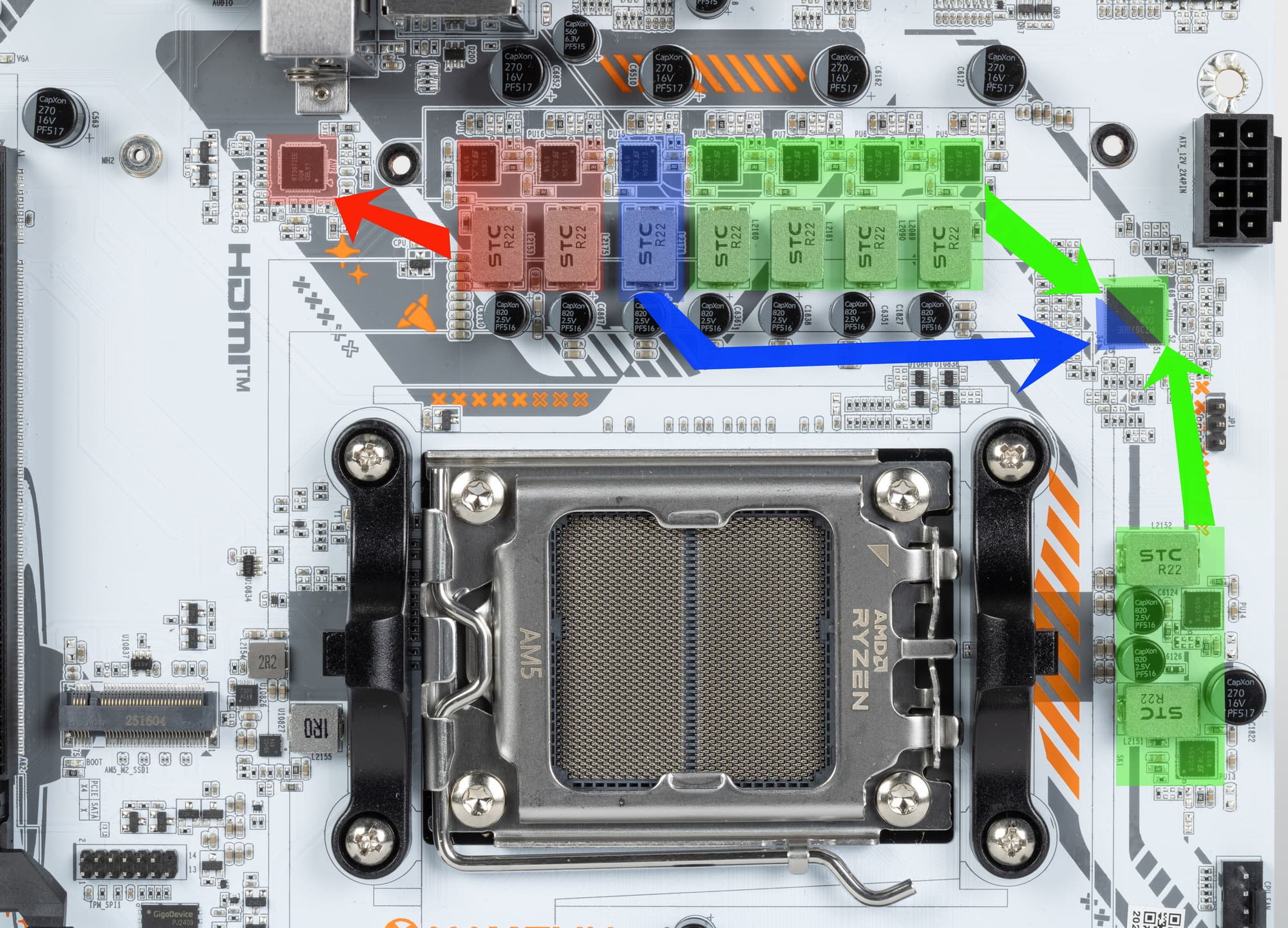 Внешне схема питания выглядит как 6+2+1: 6 фаз — ядро процессора, 2 фазы — SoC (I/O-чиплет Ryzen), 1 фаза — VDD_MISC (вывод встроенной графики).