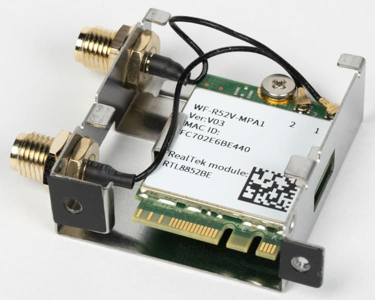 Имеется и комплексный беспроводной адаптер на контроллере Realtek RTL8852, через который реализованы Wi-Fi 6E (802.11a/b/g/n/ac/ax, 2,4/6 ГГц) и Bluetooth 5.2. Он установлен в слот M.2 (E-key), и его разъемы для выносных антенн выведены на заднюю панель.