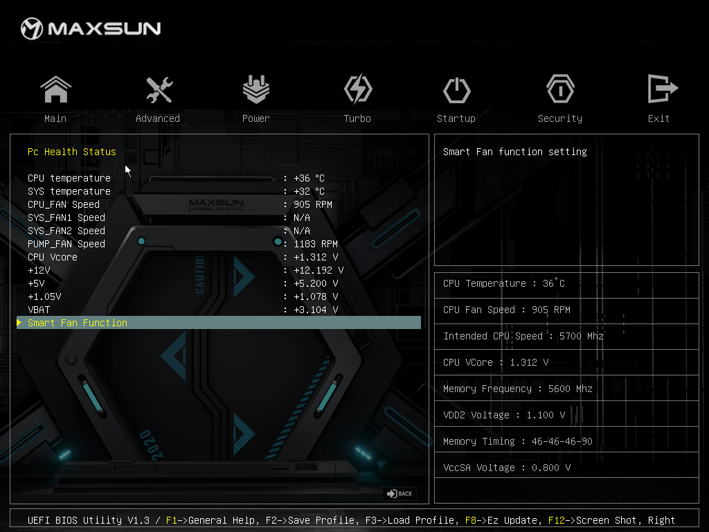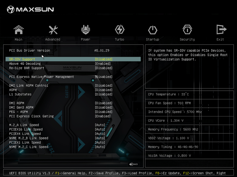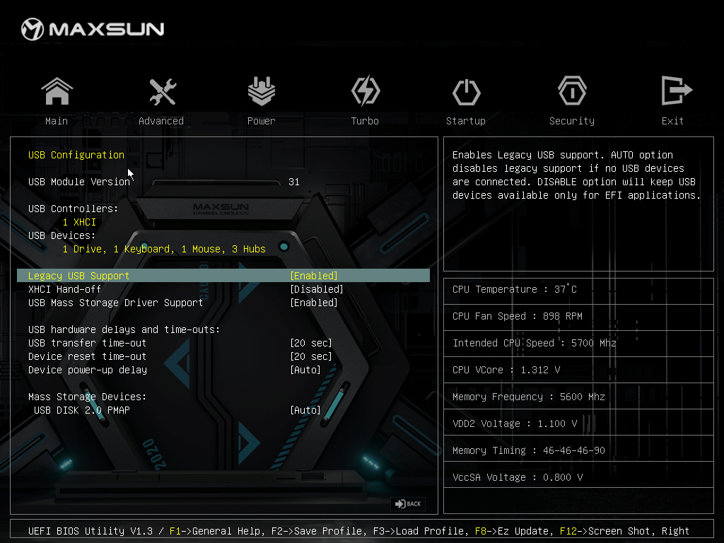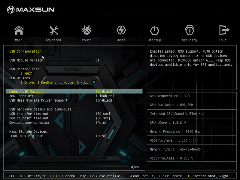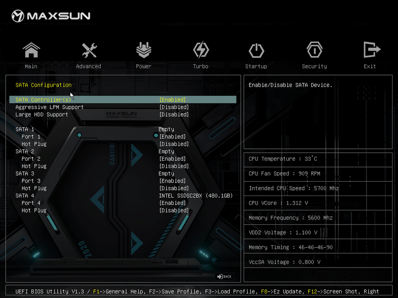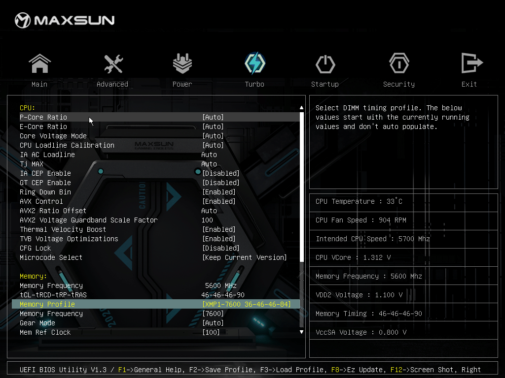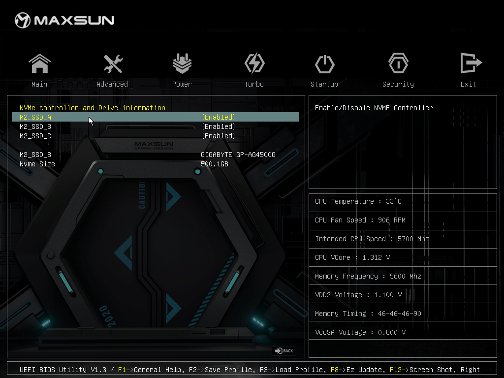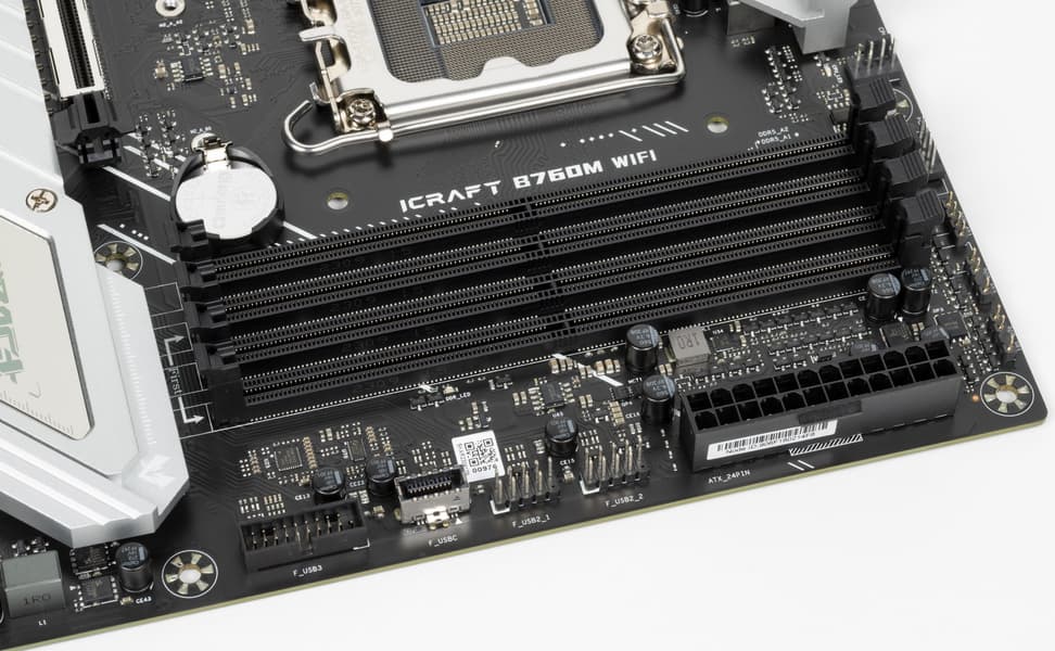 Для установки модулей памяти на плате Maxsun имеется четыре DIMM-слота (для работы памяти в Dual Channel в случае использования всего 2 модулей их следует устанавливать в А2 и B2 (отмечены белыми стрелками). Плата поддерживает небуферизованную память DDR5 (non-EСС), а максимальный объем памяти составляет 192 ГБ. Разумеется, поддерживаются профили XMP.