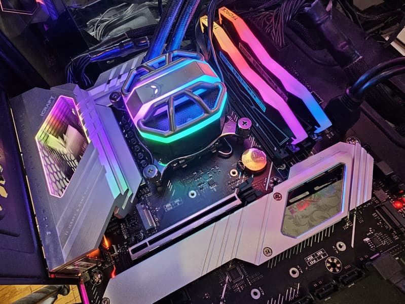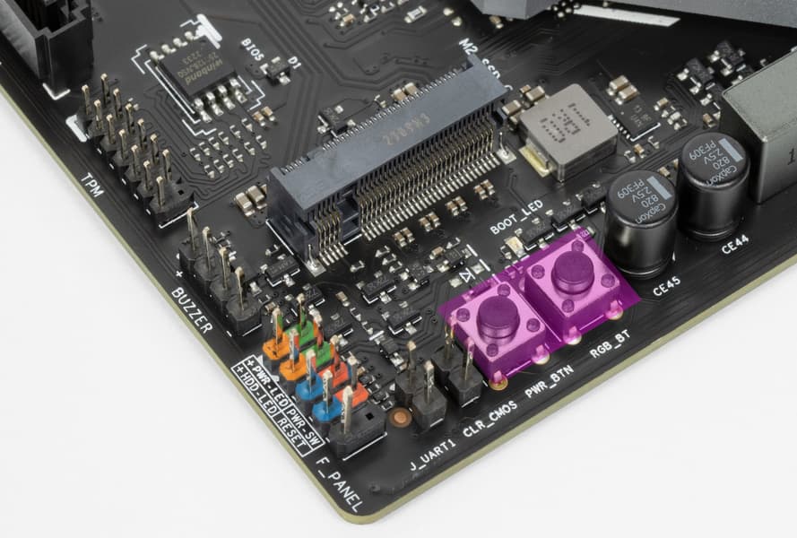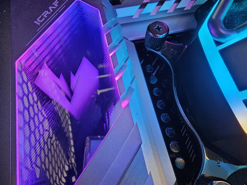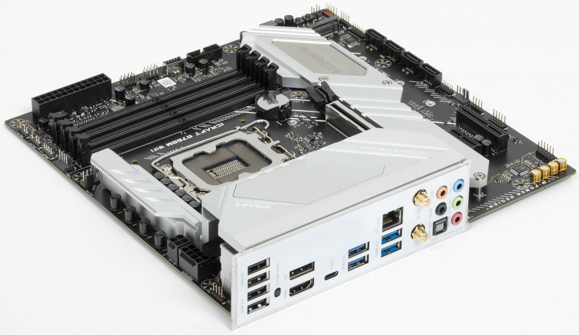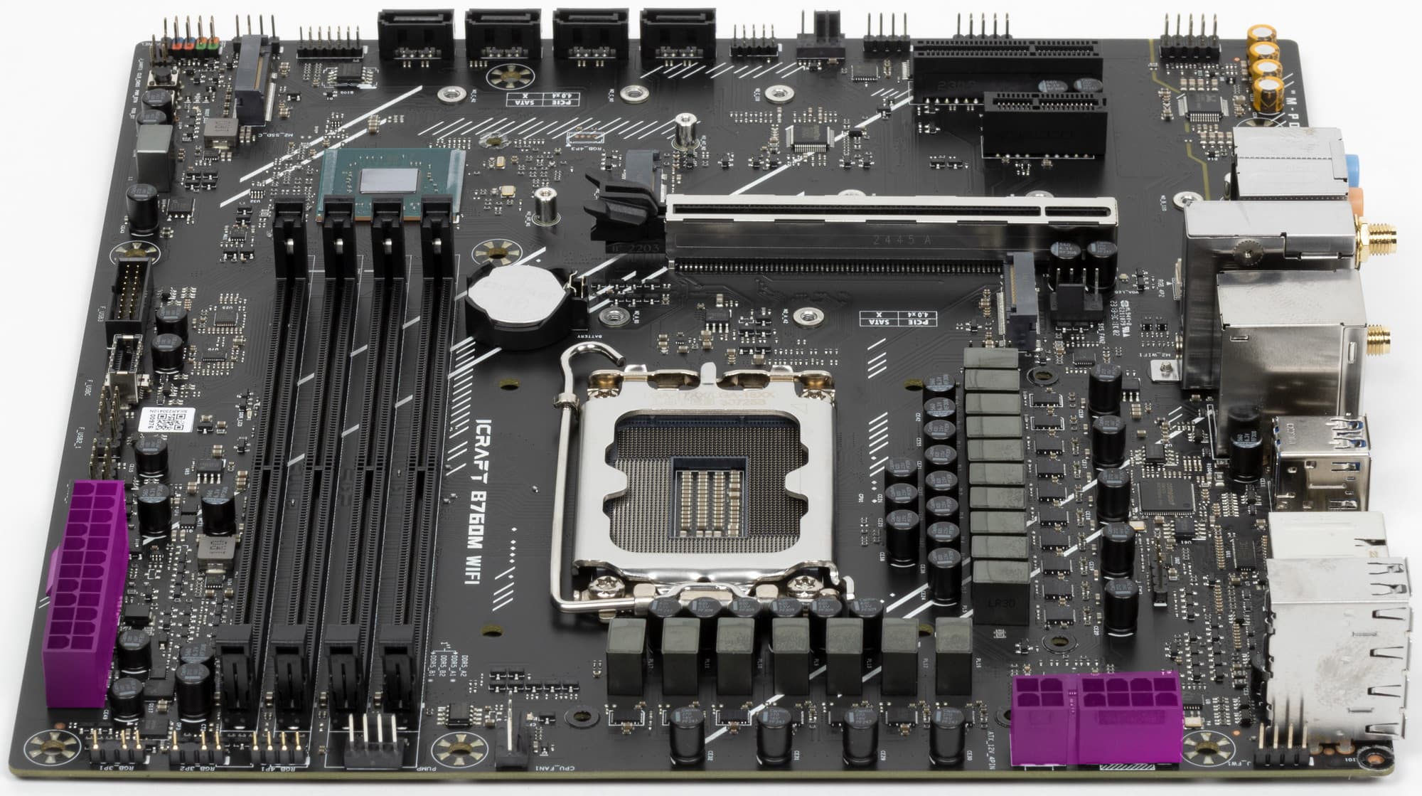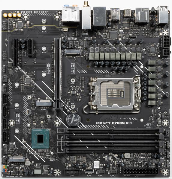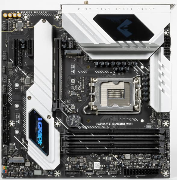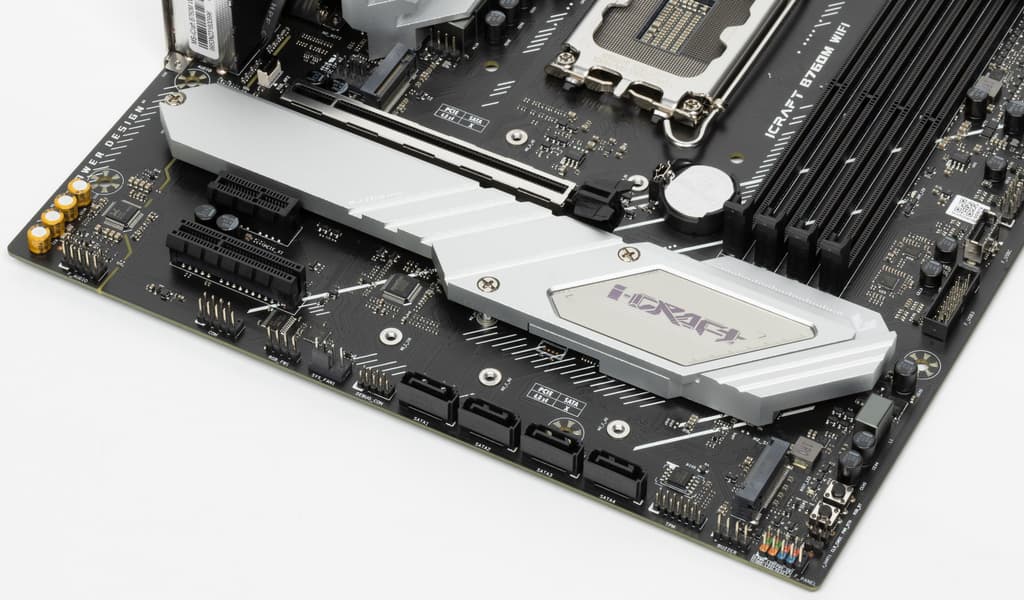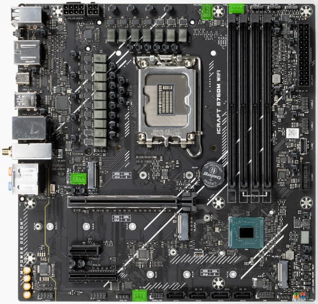 Еще у этой модели 4 порта SATA и 4 разъема для вентиляторов. Напомним, что плата относится к топовой серии iCraft, поэтому система питания процессора у нее очень мощная, она способна обеспечить работу любых совместимых процессоров с запасом на разгон. Также мы видим удовлетворительную систему охлаждения каждого потенциально греющегося элемента, однако только один слот M.2 имеет штатный радиатор. Сетевые возможности хорошие: быстрый проводной контроллер 2,5 Гбит/с, а также один современный беспроводной. В числе плюсов платы можно упомянуть широкие возможности для подключения дополнительных ARGB/RGB-устройств подсветки.