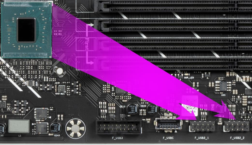 Теперь посмотрим выше на то, как работают процессоры в данной конфигурации. У CPU 12/13/14-го поколений всего 20 линий PCIe, 4 из них версии PCIe 4.0 отведены на порт М.2 (M2_1). Оставшиеся 16 линий PCIe 5.0 идут на единственный слот PCIe x16_1, поэтому вариантов переключений нет, как и мультиплексоров для этих целей.