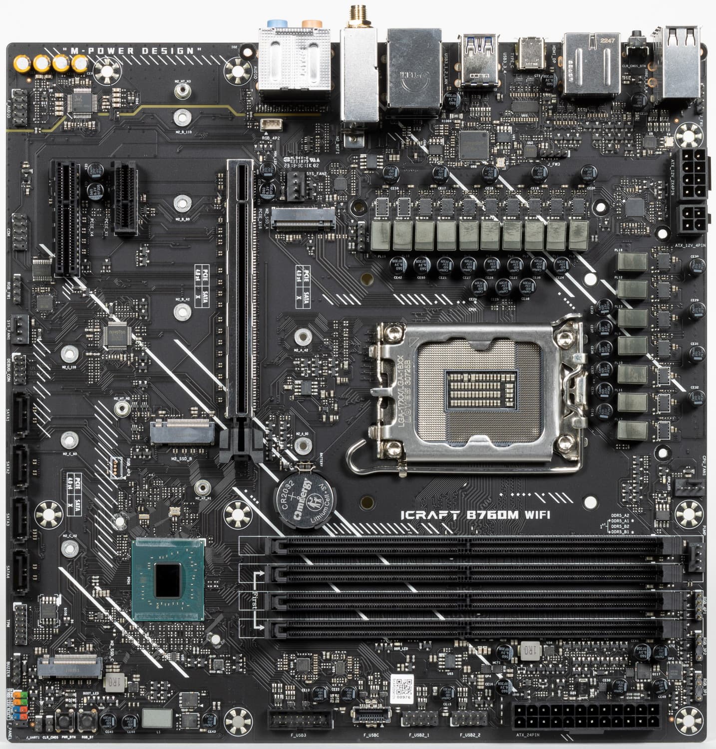 Плата прекрасно работает даже с топовыми процессорами Intel Core 14-го поколения. У нее 16 USB-портов, включая 7 быстрых USB 3.2, а также один самый быстрый USB 3.2 Gen2×2 в виде порта Type-C на задней панели. Есть слот PCIe х16, получающий от процессора 16 линий PCIe версии 5.0, а также по одному PCIe x4 и PCIe x1. У платы есть 3 слота M.2: один из них подключен к процессору, остальные — к чипсету B760, во всех случаях — линиями PCIe 4.0.