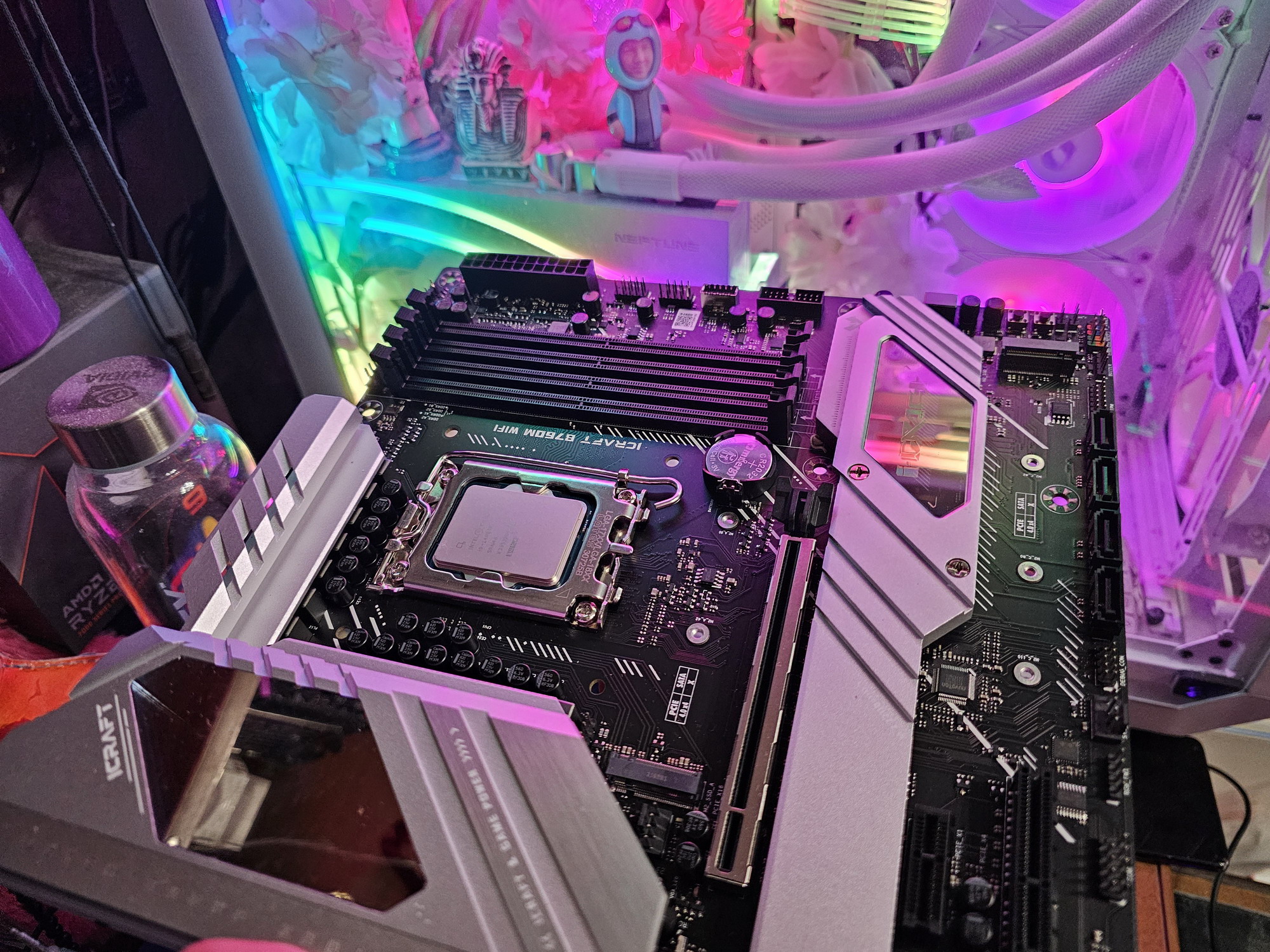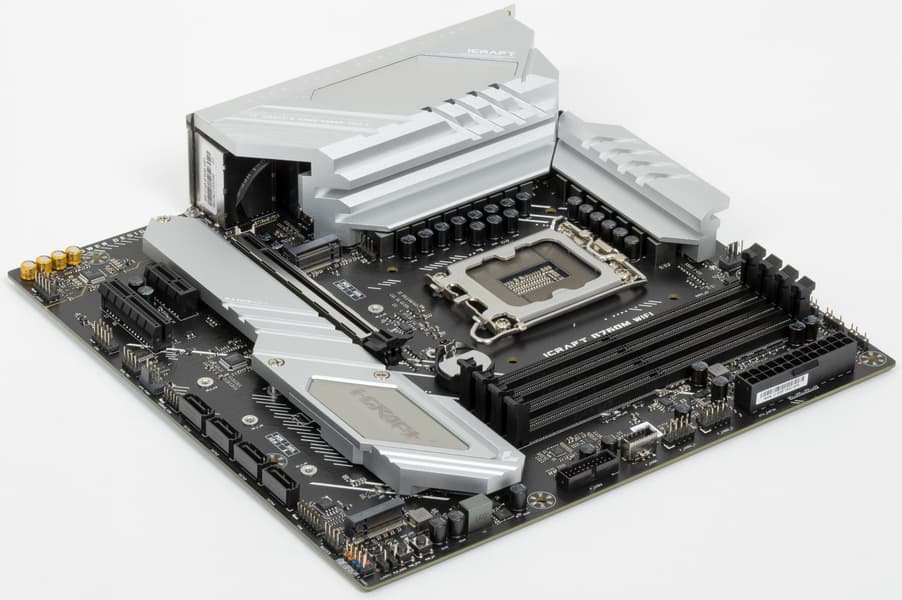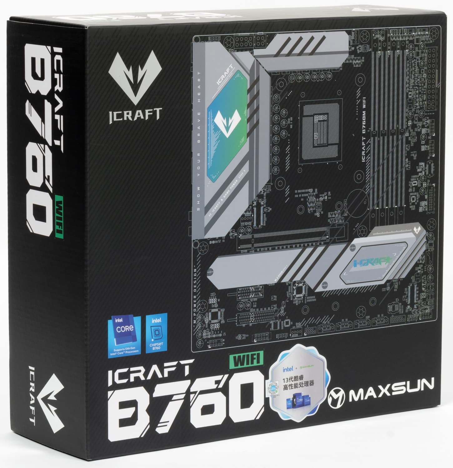 Герой нынешнего обзора — Maxsun iCraft B760M WiFi. То есть материнка из семейства iCraft, которая относится к топовой игровой серии, однако, не забываем, что сам по себе чипсет B760 подразумевает, что материнка с ним все же будет далека от флагманов.