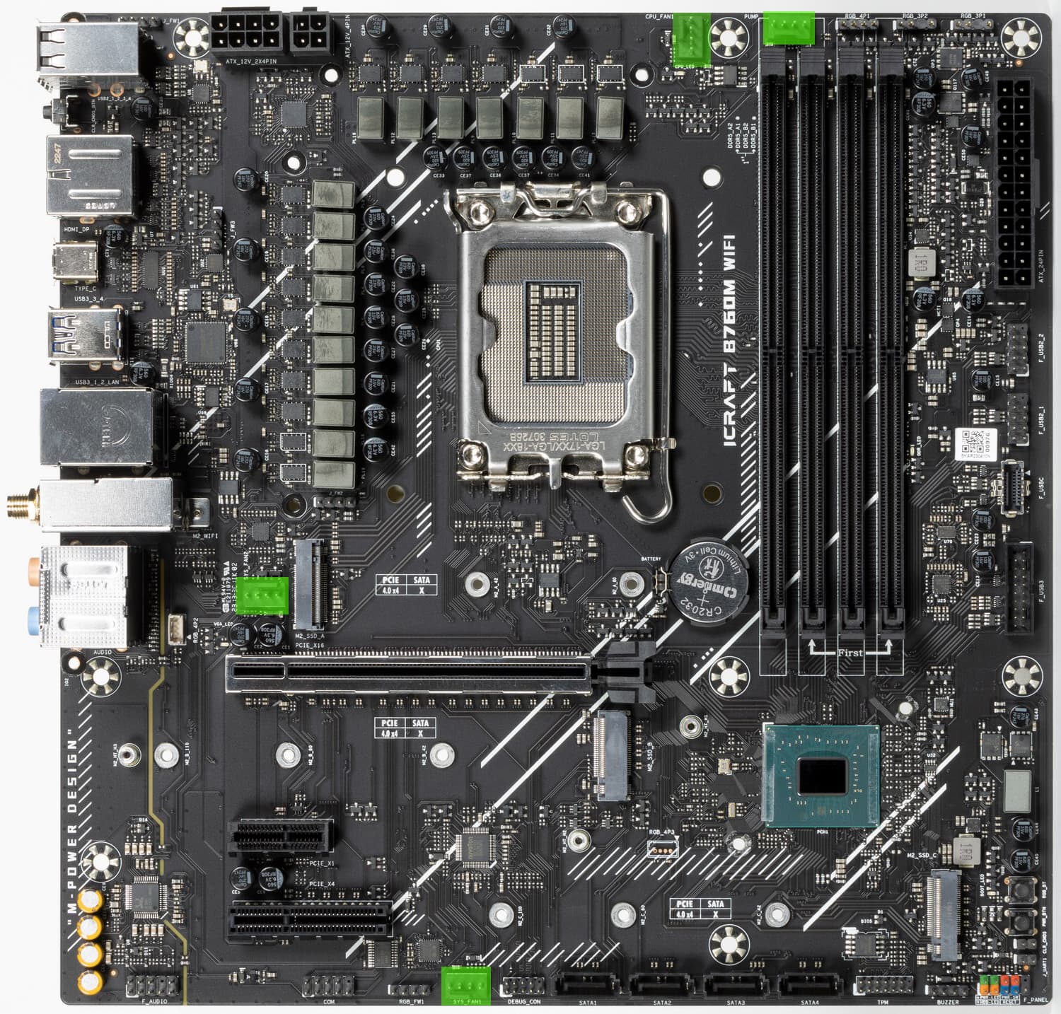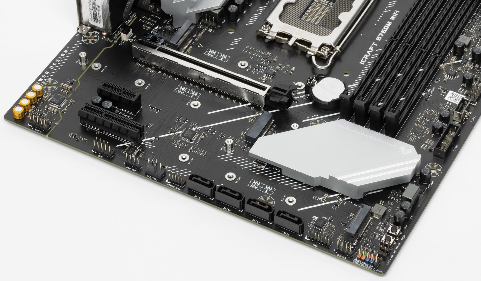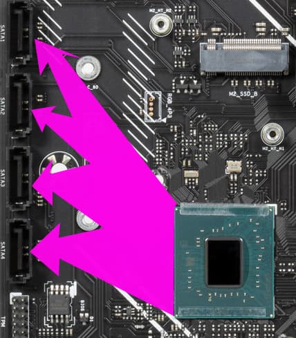 Порты SATA все реализованы через чипсет B760 и поддерживают создание RAID. Стоит обратить внимание на то, что порты SATA сгруппированы на нижнем конце платы.