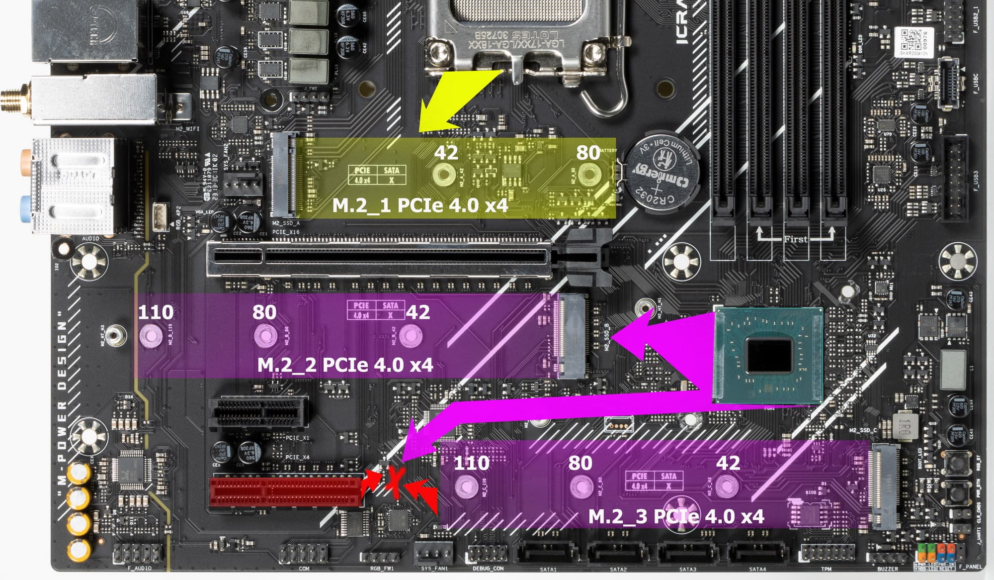 Второй M.2_2 и третий M.2_3 получают данные от чипсета B760, поддерживая PCIe 4.0, а также размер модулей 22110 . Первый M.2_1 получает данные от CPU (PCIe 4.0). На всех M.2 можно организовать RAID. Слот М.2_3 делит ресурсы со слотом PCIe x4.