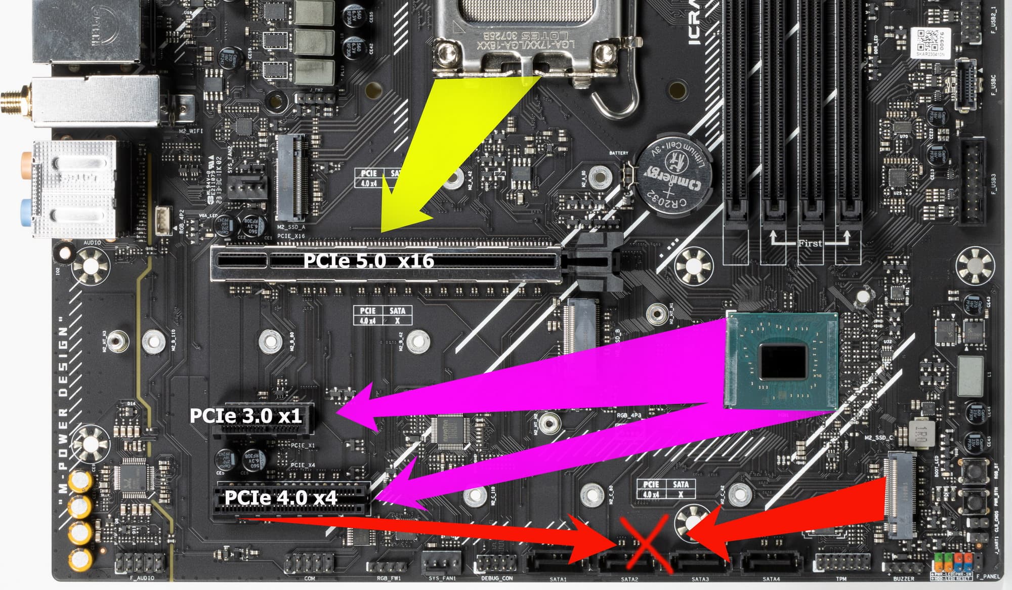 Кроме USB-портов, к которым мы подойдем позже, чипсет B760 обладает 14 PCIe линиями и 4 портами SATA. Считаем, сколько линий уходит на поддержку (связь) с тем или иным элементом (надо учитывать, что 14 линий не единой версии, а 10 линий PCIe 4.0 и 4 линии PCIe 3.0) :