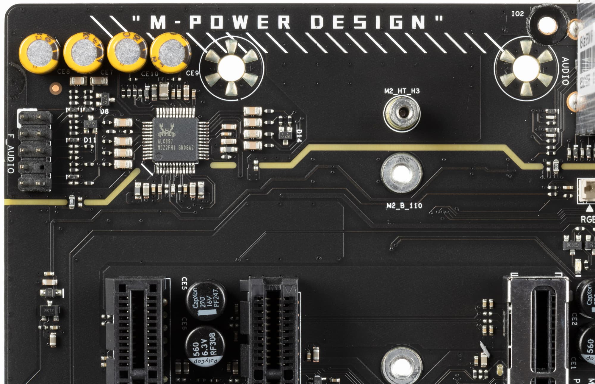 Аудиотракт вынесен на угловую часть платы, не пересекается с другими элементами. Все аудиоразъемы на задней панели не имеют привычной цветовой окраски разъемов, поэтому ориентироваться можно только по обозначениям.