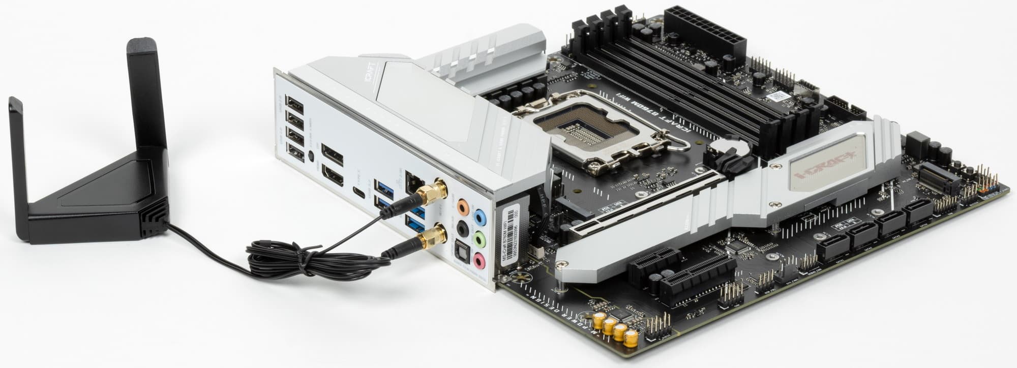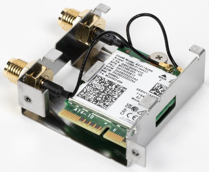 Имеется и комплексный беспроводной адаптер на контроллере Intel AX-211NGW, через который реализованы Wi-Fi 6 (802.11a/b/g/n/ac/ax) и Bluetooth 5.2. Он установлен в слот M.2 (E-key), и его разъемы для привинчивания выносных антенн выведены на заднюю панель.