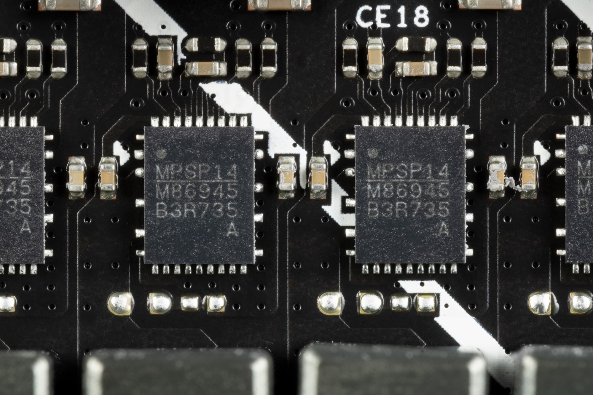 Каждый канал фазы имеет суперферритовый дроссель и MP86945/8964 MOSFET от Monolithic Power Systems на 60А.