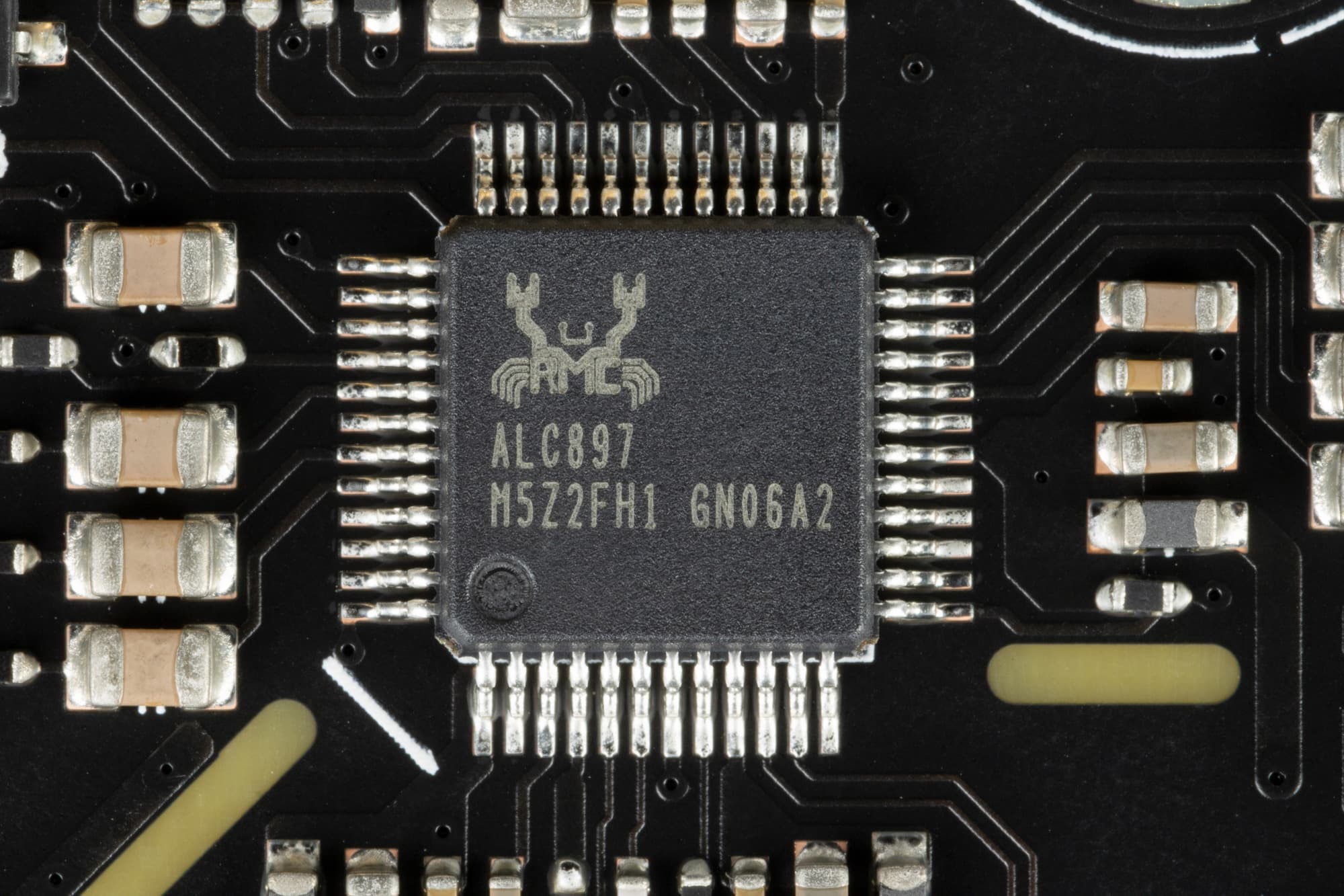 Много лет в большинстве современных материнских платах звуком заведуют аудиокодеки от Realtek семейства ALC, и долгое время это был ALC1220. Он обеспечивает вывод звука по схемам до 7.1 с разрешением до 24 бит / 192 кГц. В данном случае используется более старый и простой вариант ALC897.