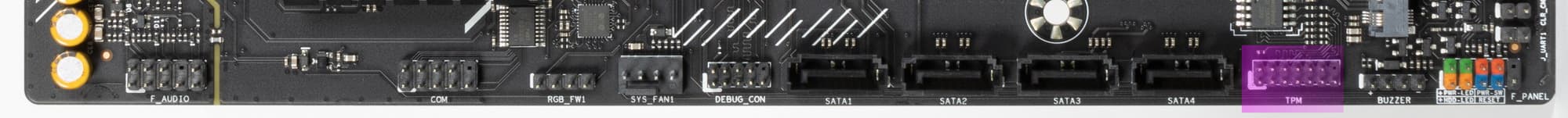 | Прочие внутренние элементы | 24-контактный разъем питания ATX 1 8-контактный разъем питания EPS12V 1 4-контактный разъем питания EPS12V 1 слот M.2 (E-key), занят адаптером беспроводных сетей 1 разъем для подключения порта USB 3.2 Gen2 Type-C 1 разъем для подключения 2 портов USB 3.2 Gen1 2 разъема 4 портов USB 2.0 4 разъема для подключения 4-контактных вентиляторов и помп ЖСО 3 разъема для подключения адаптеров подсветки (1 разъем неадресуемой RGB-ленты, 2 разъема адресуемой ARGB-ленты) 1 разъем COM-порта 1 разъем для TPM 1 разъем для подключения адаптера управления с передней панели корпуса 1 разъем для сброса CMOS |